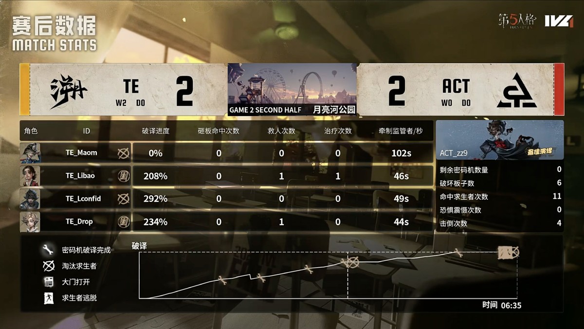 2025年11月2日,第五人格IVL秋季赛常规赛第五周第三日的比赛结束。在当天的比赛中,TE以2胜0平0负的战绩(10:6)击败了ACT,以下是本场比赛战报。