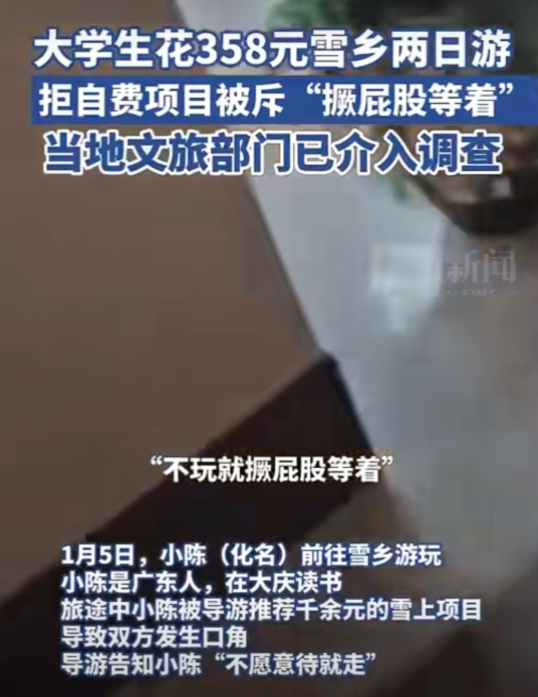 官方通报雪乡导游让游客撅屁股等着 各地文旅局都在想着办法宠游客,那边也有不合群的地方拖后腿,还在低价团的乱象里走不出来。 1月5号,一女子自爆花了358块钱报了黑龙江哈尔滨雪乡两日游的团,导游强售套票未果,竟然放话让她撅屁股等着。 1月8号,尚志市文体广电和旅游局发布通报称,涉事导游已向游客公开道歉达成谅解,对涉事旅行社已按照相关法律法规开展调查处理。 这哈尔滨都公布正确答案了,怎么还有人抄答案给它全抄错了呢,靠低价团揽客,靠强买强卖赚钱,怎么对得起刚刚掀起的东北旅游热。