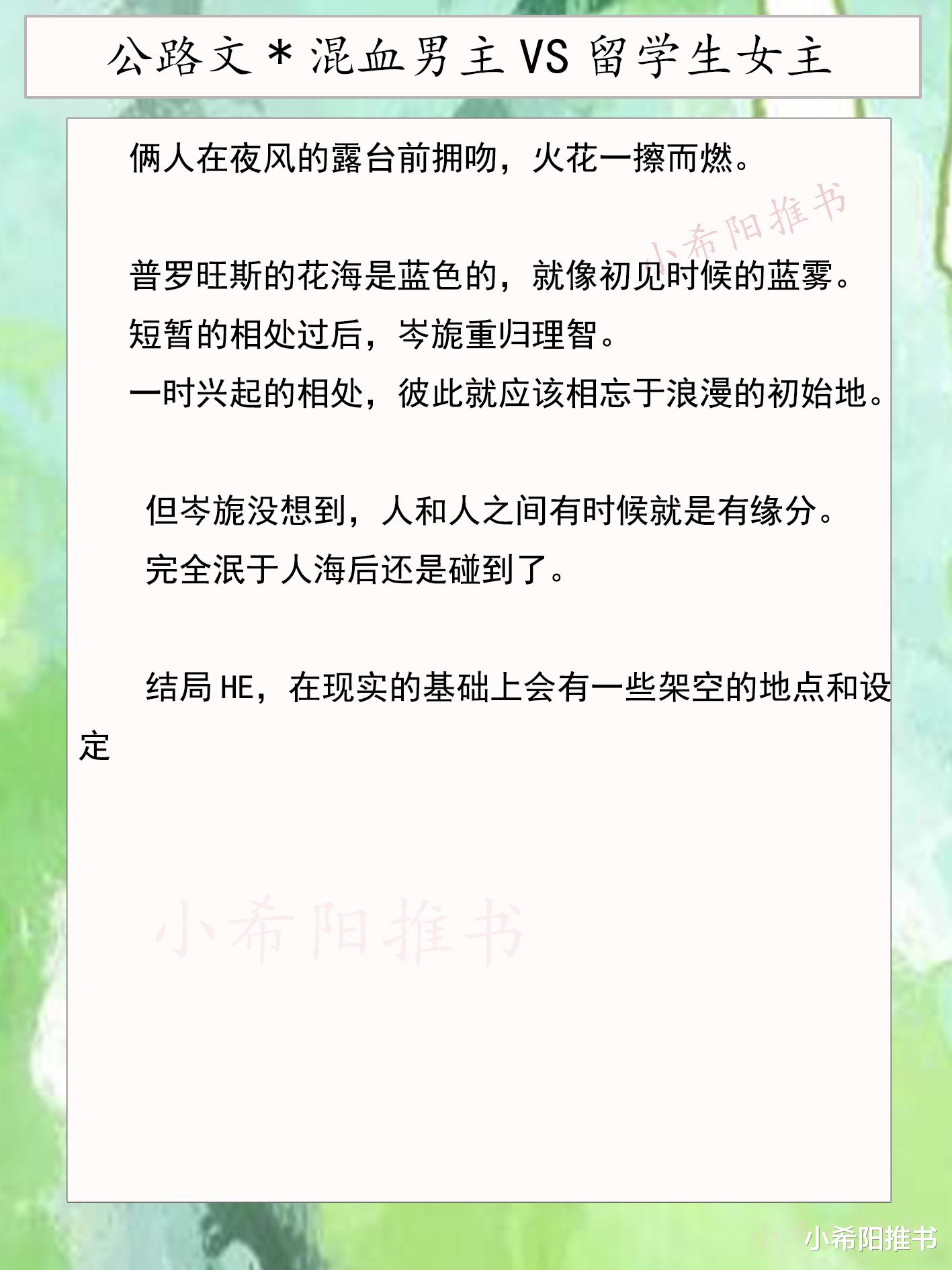 推荐一本好看的公路文,浪漫钓系女学生vs痞帅军校贵公子,两个不婚主义者在异国他乡一见钟情,开启了一段露水情缘。缘分使两人一次次相遇,成年人的爱情热烈真挚。两人被迫分离时,本属于两个世界的人,终将为了爱情克服重重困难,幸福地在一起!这本也可追的!