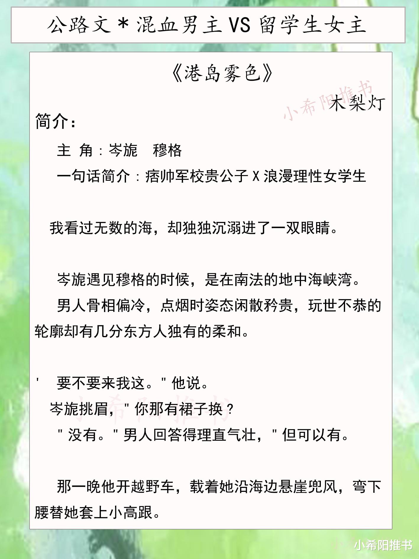 《港岛雾色》这本公路文真的挺好看的,明媚钓系女学生vs痞帅军校贵公子,两个不婚主义者开启了一场恋爱长跑。