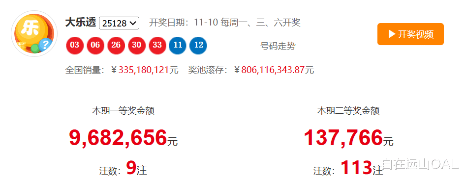 2025128 期大乐透开奖落幕,前区 03、06、26、30、33 搭配后区 11、12的组合爆冷出圈,8.06 亿奖池开出 9 注千万头奖,引发彩民热议。今天,我们将深入解析第2025128期大乐透的开奖号码,并结合近20期历史数据(第109期至128期),为您带来一场精彩的分析之旅。