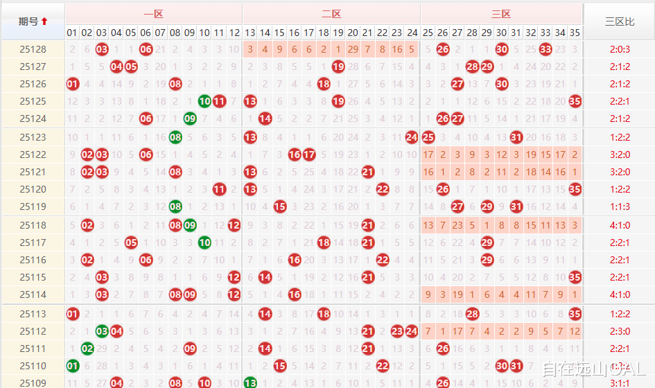 前区号码中,03、08、13等热号频繁出现(例如08在第109、114、118、121期均有),而冷号如01在近期开始回补(第126期有01)。