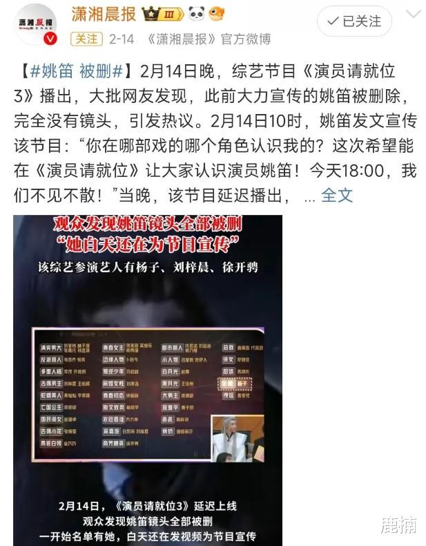 节目播出之后,有网友发现姚笛的镜头全被删除。