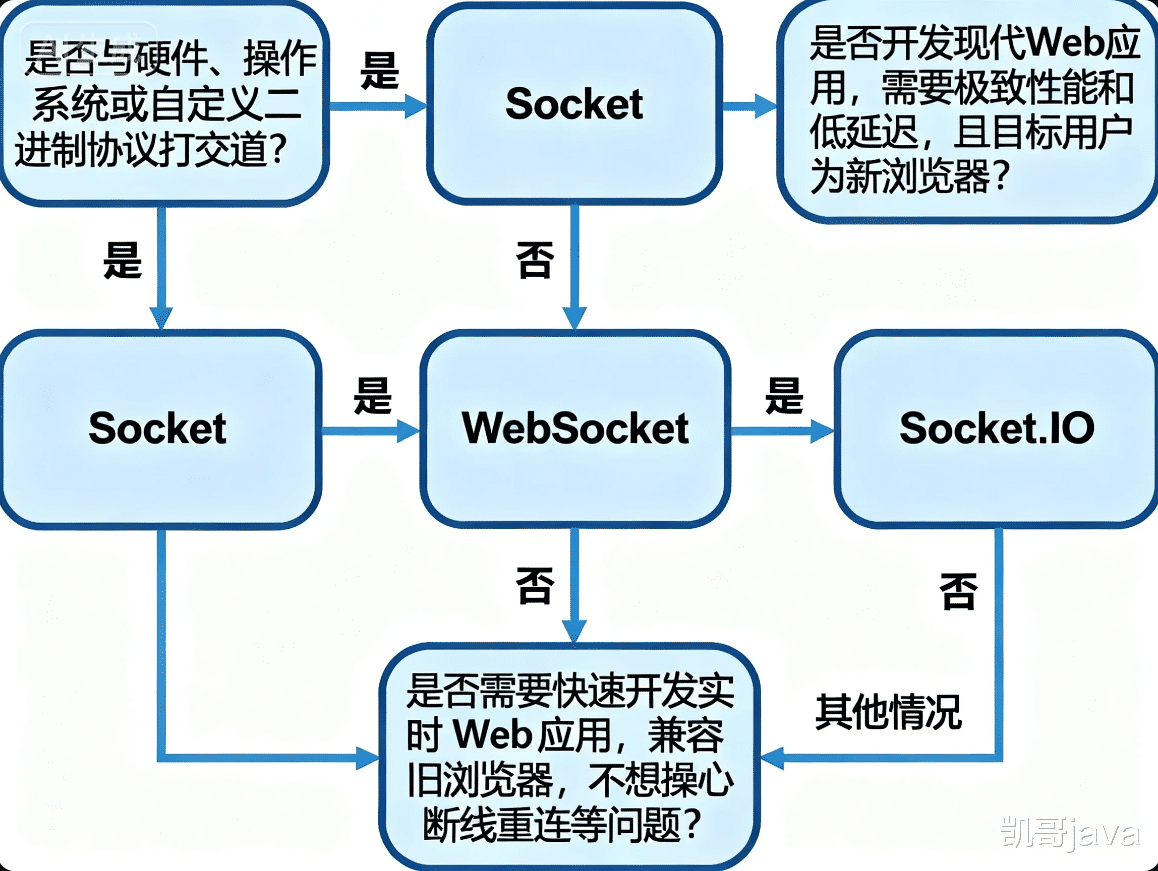 下图清晰地展示了三者的层次关系和核心区别:核心区别对比表特性维度Socket (套接字)WebSocket (协议)Socket.IO (库)本质操作系统提供的API独立的通信协议 (RFC 6455)基于JavaScript的库层级底层通信接口上层应用协议上层应用框架通信模式灵活(可TCP/UDP,单向/双向)TCP之上的全双工基于WebSocket的全双工核心功能IP地址+端口通信,数据流传输浏览器与服务器的双向实时通道更高级的功能抽象:- 事件通信- 自动重连- 房间广播- ACK回调兼容性通用,与平台语言无关现代浏览器所有浏览器(自动降级)开发难度高(需处理所有底层细节)中(需自己实现心跳、重连等)低(开箱即用,功能完善)性能开销极低(几乎无额外开销)低(少量协议头开销)中(有库的元数据开销)典型应用任何网络程序、操作系统底层需要低延迟双向通信的Web应用需要快速开发、高可靠性、兼容性强的实时应用一个生动的比喻
