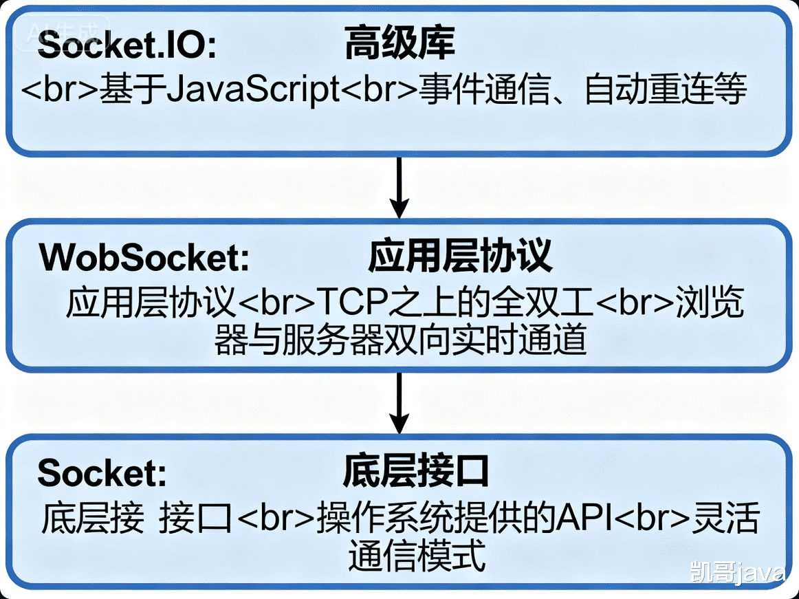 我们可以对 Socket、WebSocket 和 Socket.IO 三者做一个清晰的分层总结和对比。