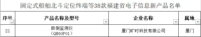 近日,福建省工业和信息化厅公布38款福建省电子信息新产品。旷时科技跌倒监测仪凭借创新技术与实际应用价值成功入选。此次入选标志着公司在智慧养老与健康监测领域的技术实力再次获得省级权威认可,也为福建省养老机构、社区及家庭用户提供了更高效、更安全的智慧养老解决方案。