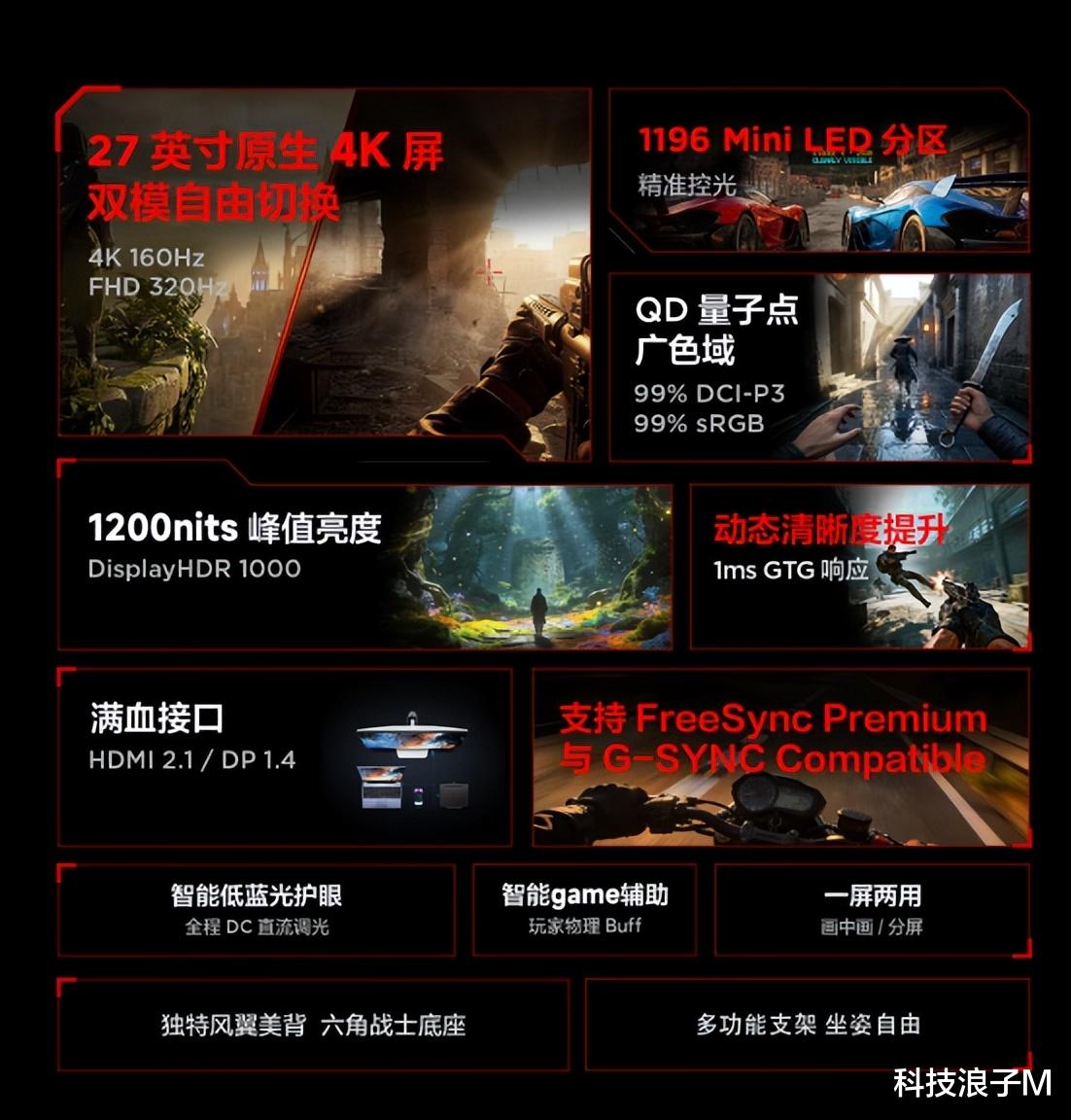首先雷鸟狩猎者II代的27U8A Pro绝对是本次发布会的重头戏,它的核心杀手锏就是 OSD一键双模切换,这可不是简单的参数调整,而是真真切切的全场景适配。平时修图、看HDR电影或者玩《艾尔登法环》这类3A大作,切到4K 160Hz画质模式,2304 分区的QD MiniLED屏能把暗部细节和高光层次拉满,ΔE<2的专业色准连修图的色彩要求都能满足,2000nits的峰值亮度让HDR画面的冲击感直接拉满。