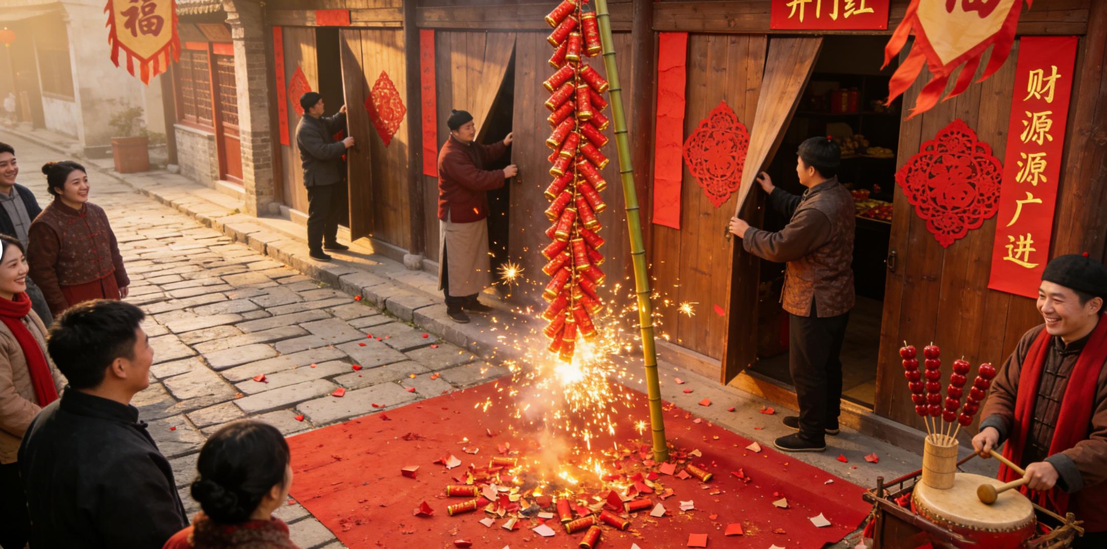 对于做生意的商家来说,初五还是个特别重要的日子——开市日。春节期间关了好几天的店铺,就等着这天重新开门营业呢。开市的时候要放鞭炮、贴红纸,讨个"开门红"的好彩头。所以你看,初五这天的鞭炮声特别密集,送穷神要放,迎财神要放,开市也要放,整个村镇都沉浸在噼里啪啦的喜庆氛围里。