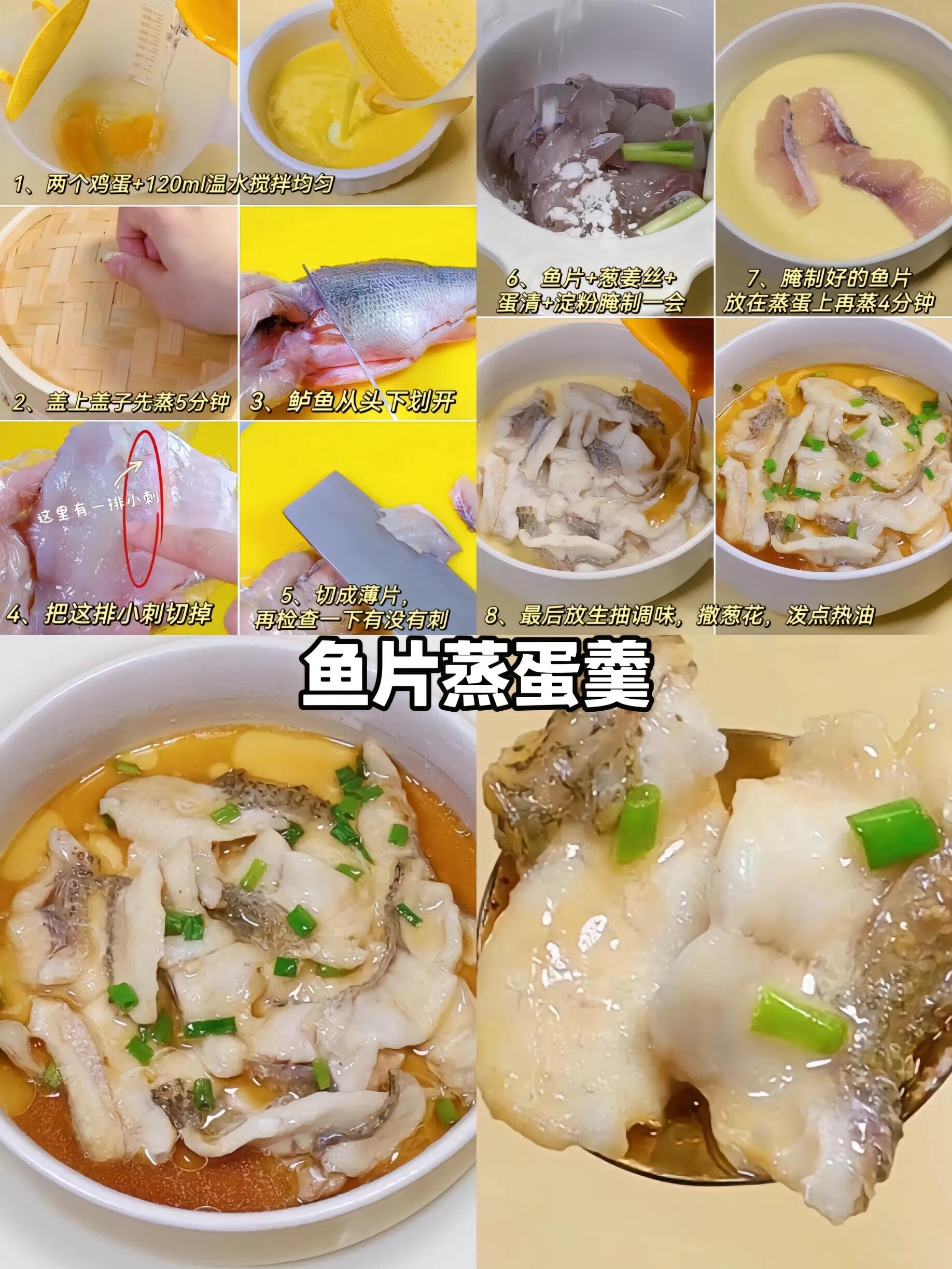 • 嫩滑双杀:鸡蛋+温水搅匀蒸5分钟,铺上腌好的鱼片再蒸4分钟,淋生抽和热油,蛋羹滑嫩,鱼片鲜甜!蒸蛋技巧:温水和鸡蛋1:1,过筛后蒸,蛋羹像布丁一样嫩,零蜂窝。