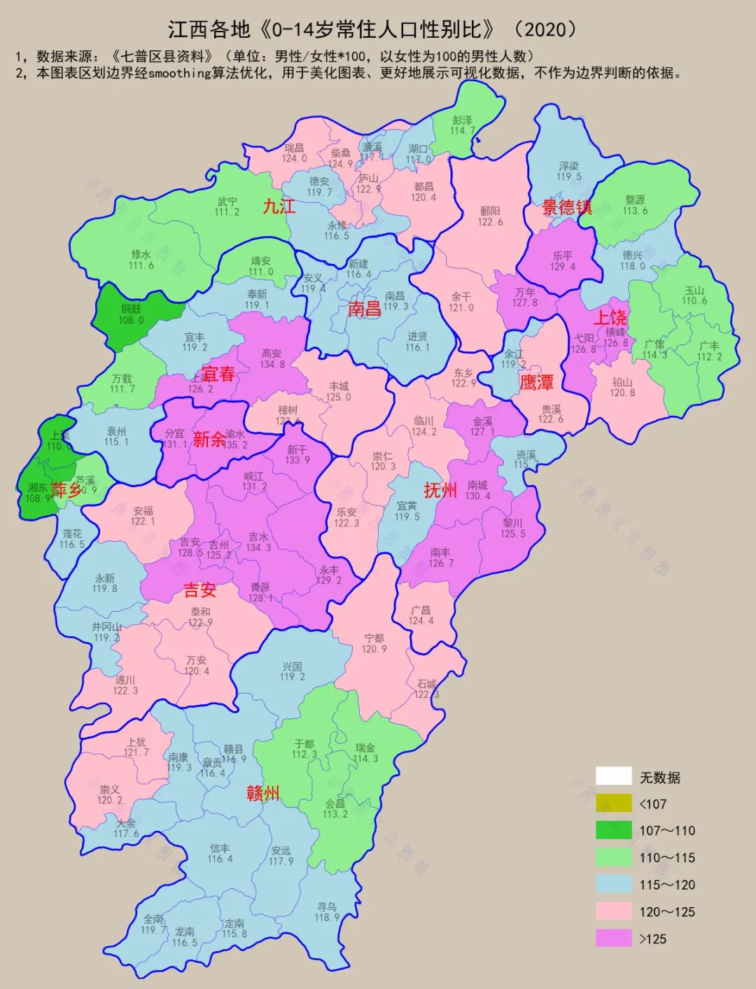 图表中黄色表示性别比在107以下,图表中并无以此填充色展示的区域,这表示以区县为统计单位的话,江西各地0-14岁常住人口性别比均超过了107。