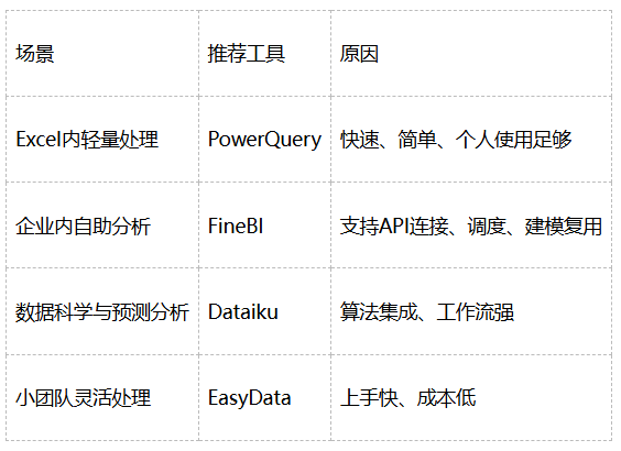其实我并不认为FineBI、Dataiku、EasyData这些工具是在“取代”PowerQuery。 它们更像是不同阶段的数据处理能力扩展。