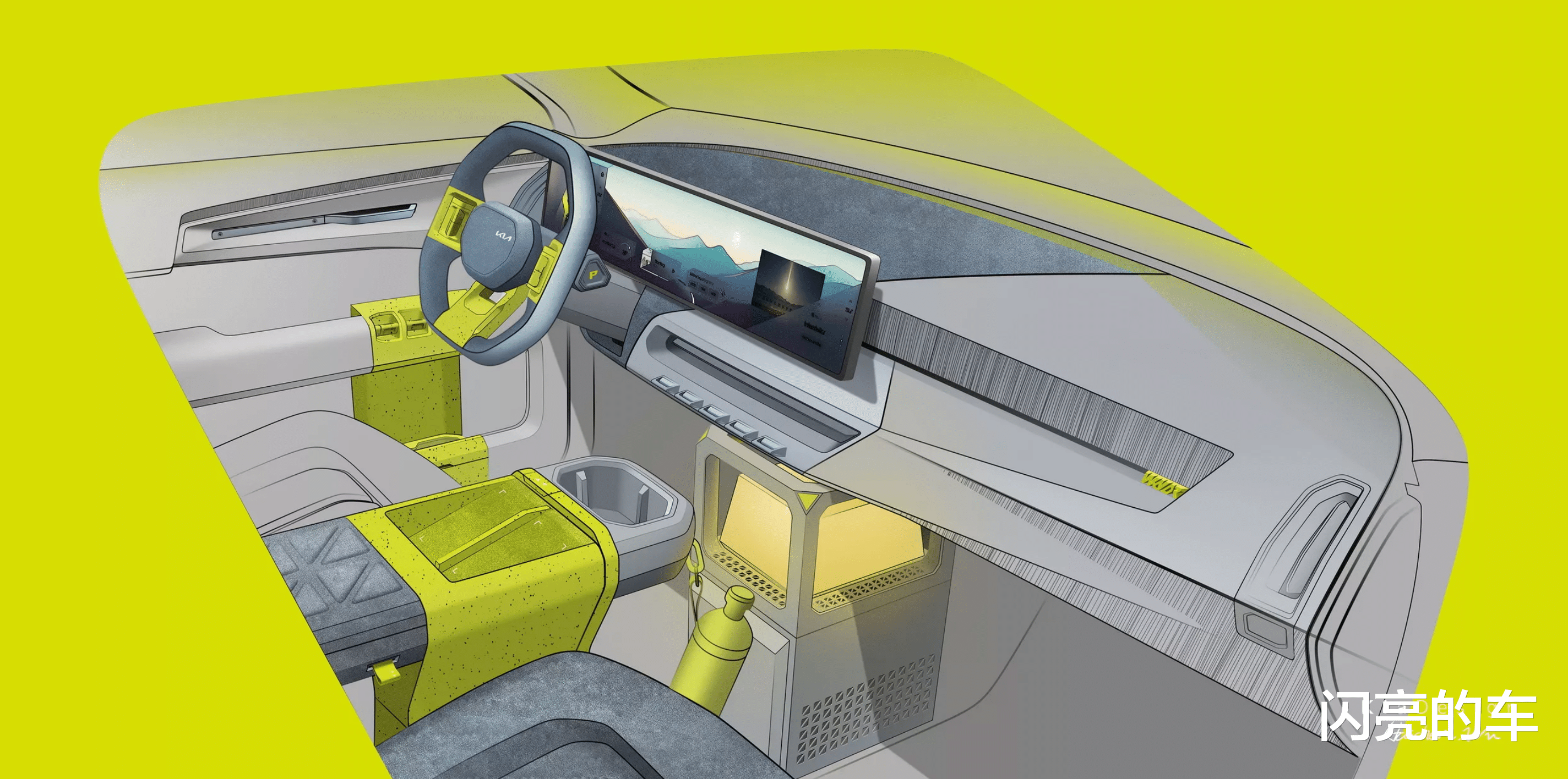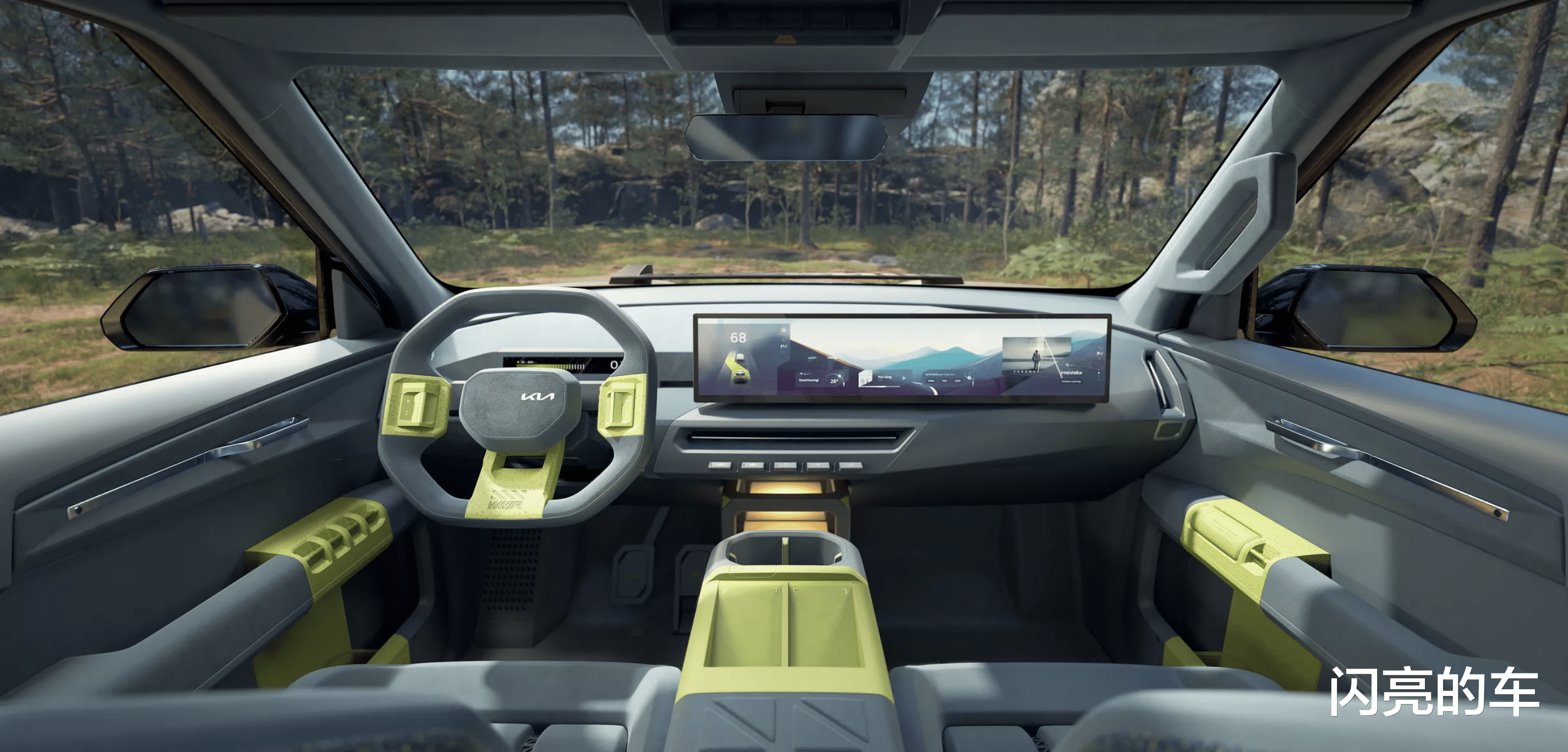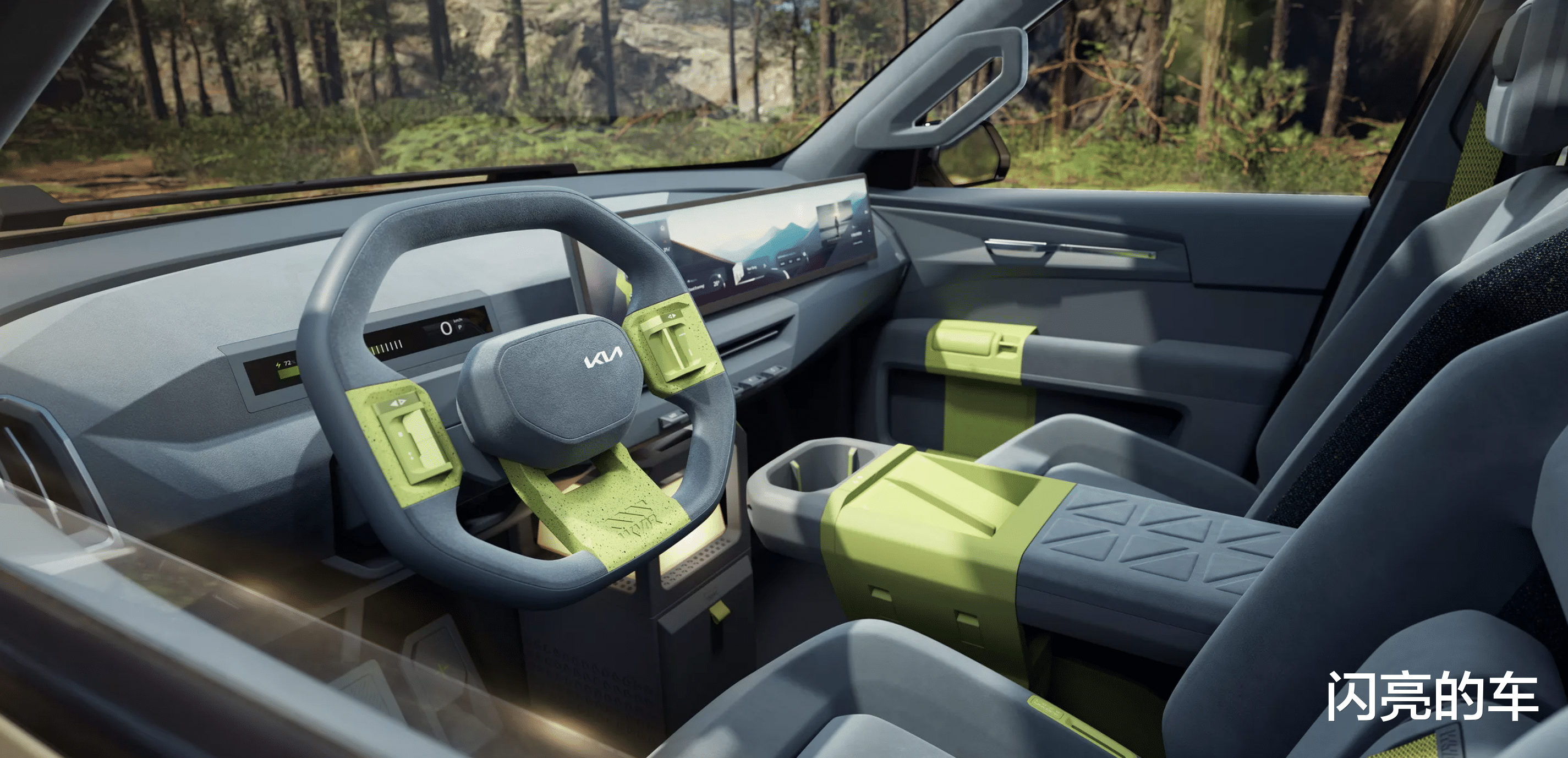 作为一款概念车,内饰怎么能普通呢,虽然是基于量产车改造,但EV5 Weekender的内饰却做出了极大的改动,颜色上采用了灰色+绿色的双拼,将外部绿色更多的延伸到了车内,方向盘采用了全新设计的三幅式,更加的简洁。方向盘后面则是一个长条形状的数字仪表盘,右侧则是一块超大尺寸的中控屏,一直延伸到了副驾驶,应该是可以进行分屏操作的。