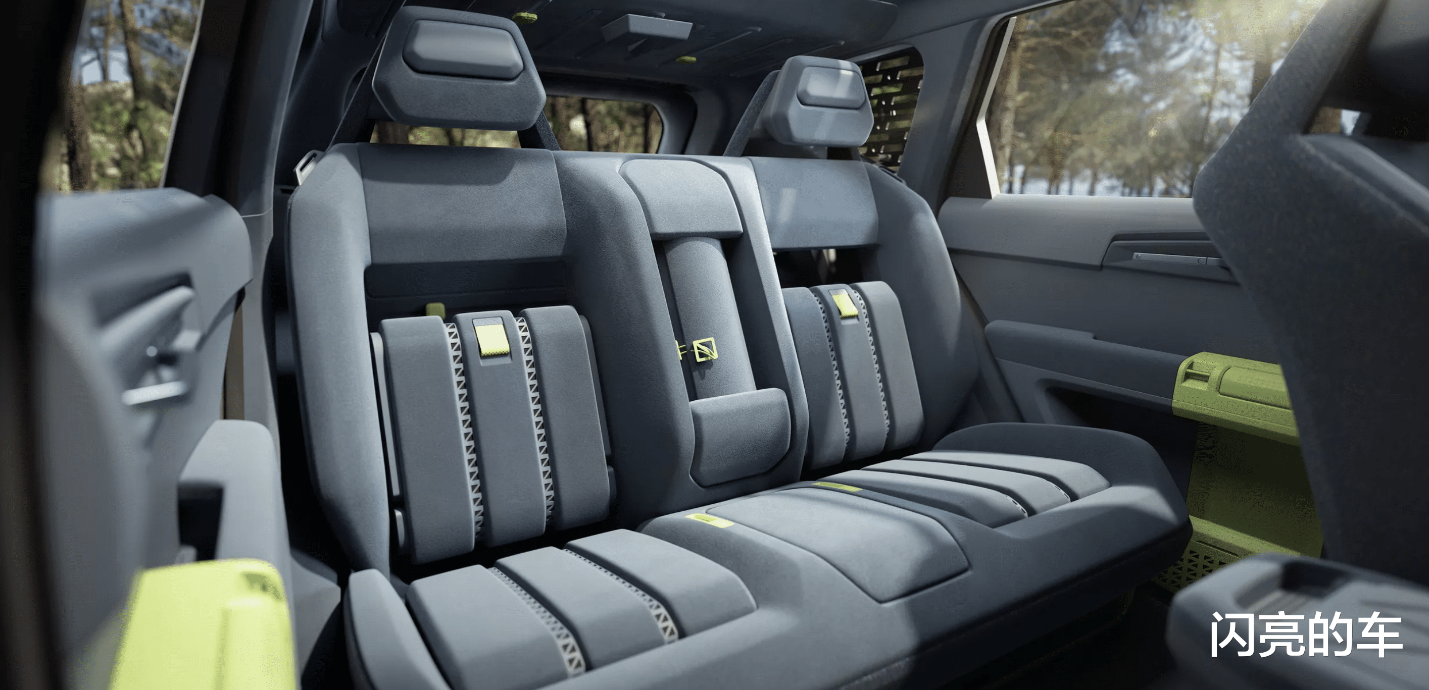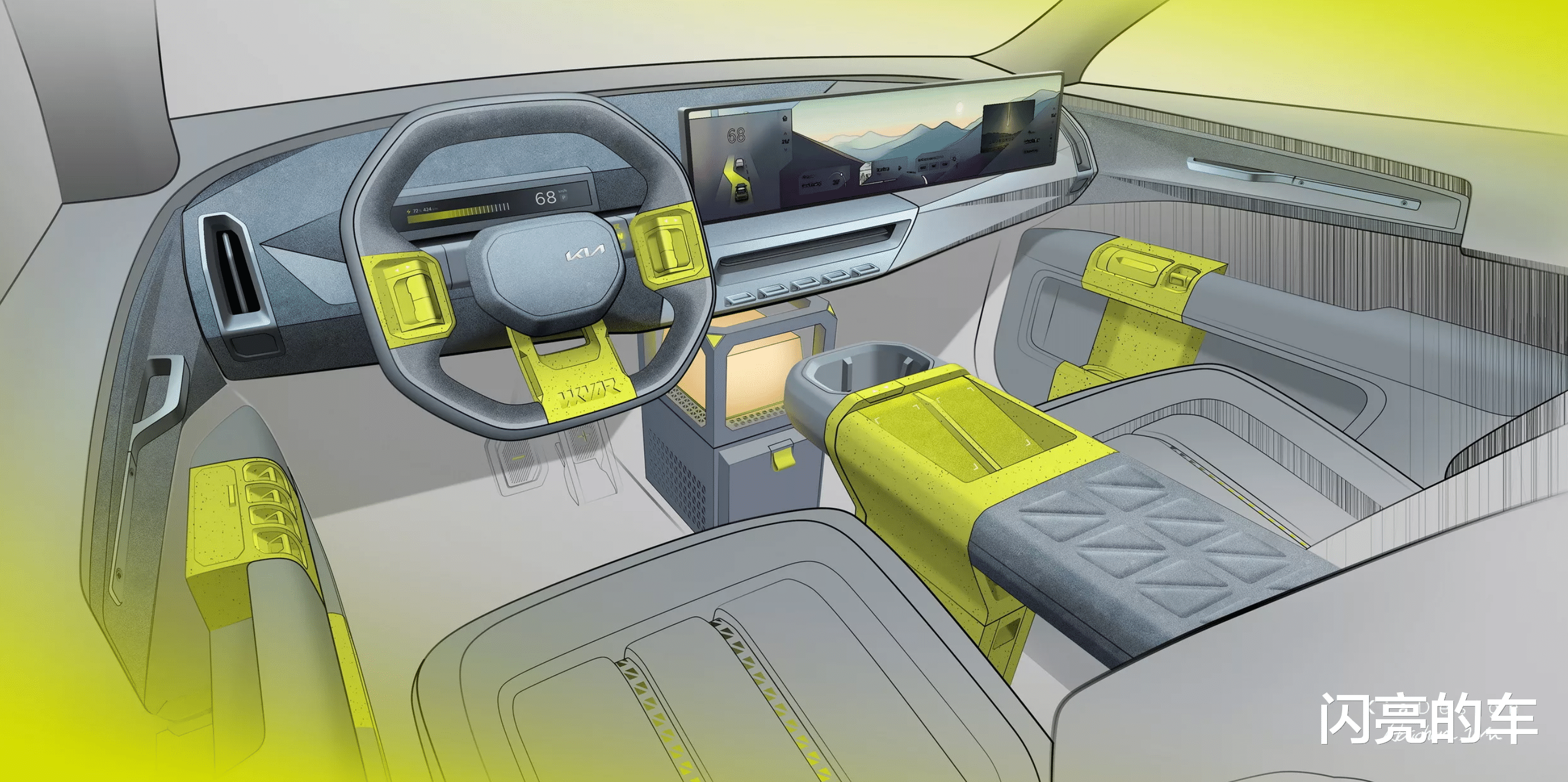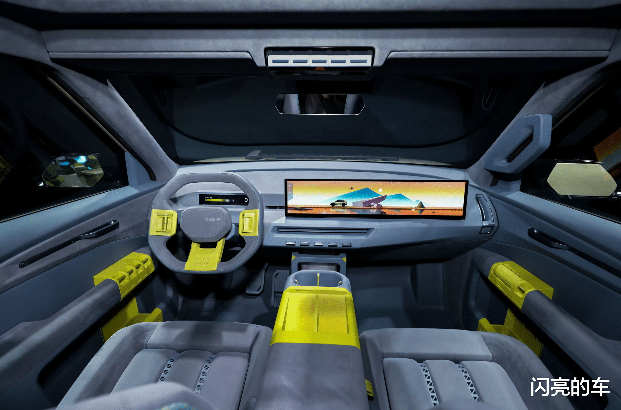 作为一款概念车,内饰怎么能普通呢,虽然是基于量产车改造,但EV5 Weekender的内饰却做出了极大的改动,颜色上采用了灰色+绿色的双拼,将外部绿色更多的延伸到了车内,方向盘采用了全新设计的三幅式,更加的简洁。方向盘后面则是一个长条形状的数字仪表盘,右侧则是一块超大尺寸的中控屏,一直延伸到了副驾驶,应该是可以进行分屏操作的。
