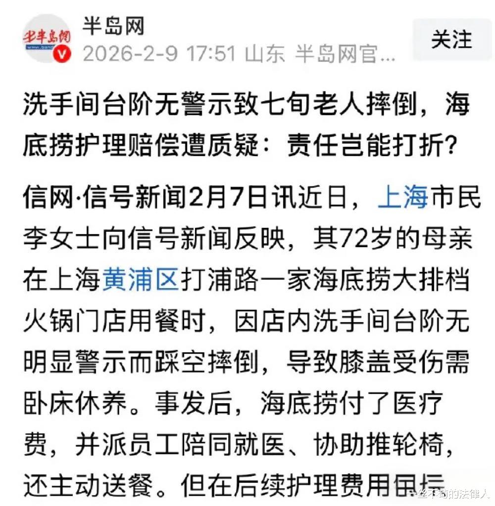 上海李女士一家在火锅店聚餐时,72岁的母亲独自去洗手间,因台阶与地面瓷砖颜色、花纹完全一致,视觉上难以分辨,老人误判为平地一脚踩空,重重摔伤。事后治疗加护工费用共计8000元,店方起初只愿赔偿2000元。经协商,店家最终承担了护理费用。台阶“隐形”的设计隐患与商家的安全保障责任,成为本案焦点。