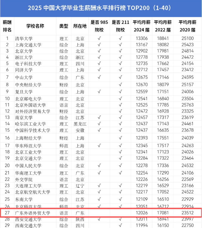 在中国薪酬网发布的《2025年全国高校毕业生薪酬排行榜TOP200》中,广外的24届毕业生排名第27名,24届月平均薪资达12026元,领跑同类院校。薪资的数字背后,是“语言+专业”的复合实力在说话,也正是这份实力,让他们求职时能挑到既对口又高薪的岗位。