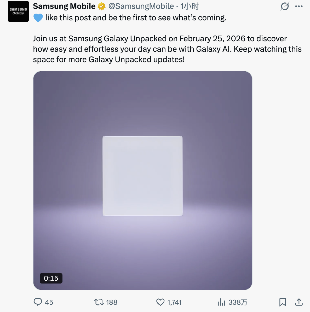 2026年2月11日,三星官宣,将于当地时间2月25日下午1点(北京时间2月26日凌晨2点)在美国加利福尼亚州旧金山举办Galaxy Unpacked发布会,届时将发布Galaxy S26系列手机。