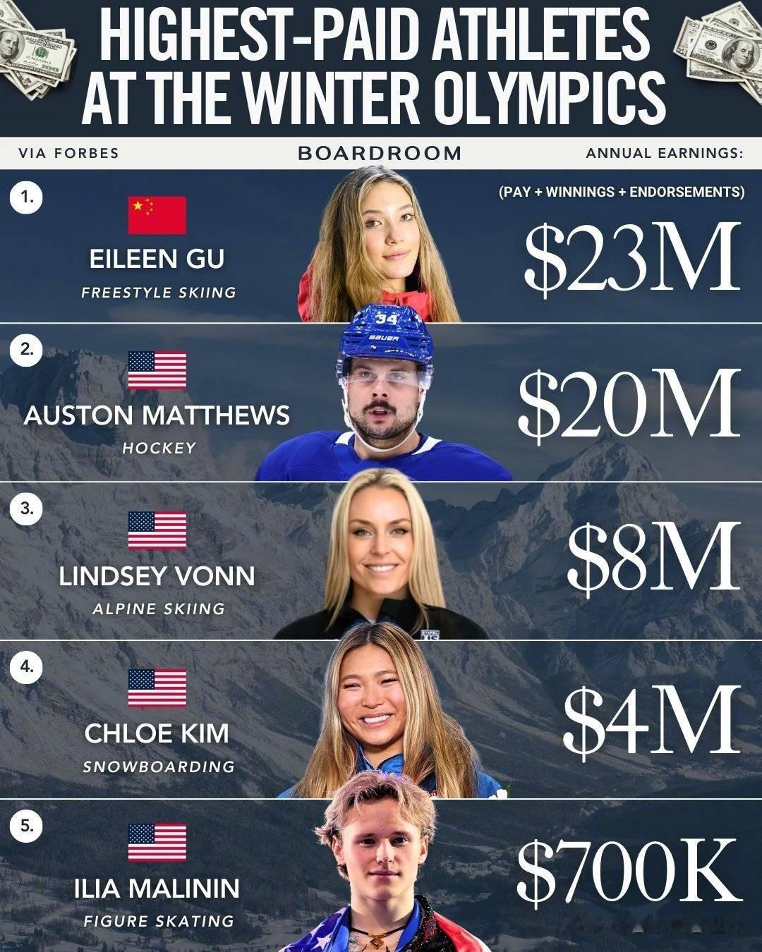 这数字什么概念?五大热门项目里,排第二的NHL冰球明星奥斯顿·马修斯是2000万美元,第三名高山滑雪老将林赛·沃恩800万,第四名单板滑雪的克洛伊·金400万,第五名花滑小将伊利亚·马利宁才70万。