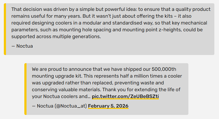 由此可以看出即使是对于17年前甚至更久远的老款散热器,猫头鹰也并未放弃支持。该品牌表示,只要是旗下正式发售的零售产品,无论时间过去了多久,都会根据用户需求来推出对应新平台的升级套件。并且从官网申请的绝大部分套件完全免费,而通过本地经销商也可以更快的获得升级套件。