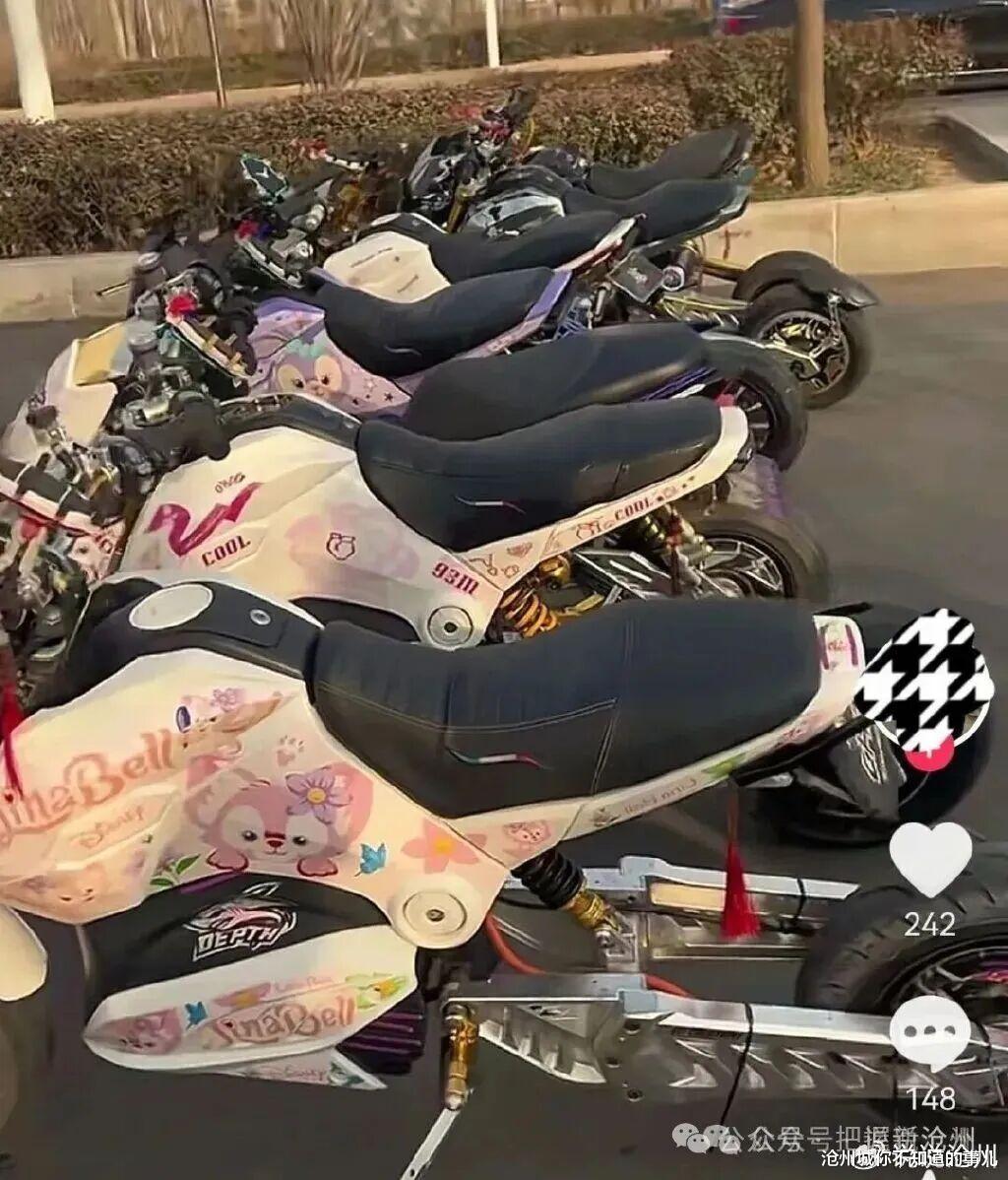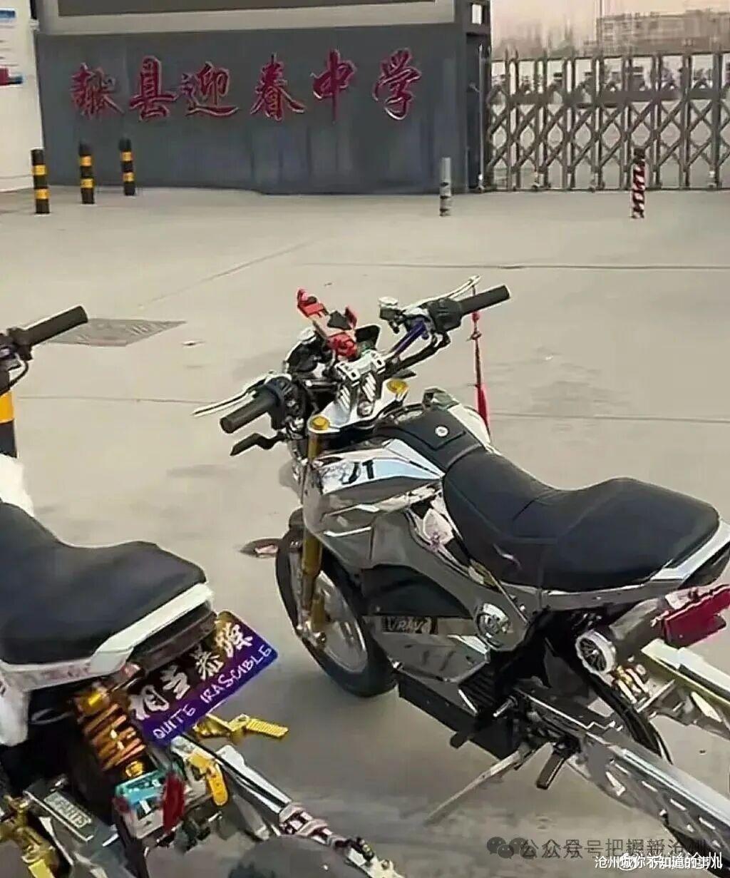 献县迎春中学火了!学校门口停放在几十辆爆改电摩,引来无数目光,不知道的以为学校电摩车展啦。献县迎春中学门口的电摩。