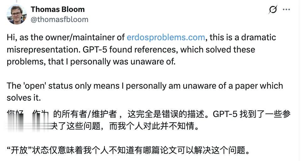 作为erdosproblems .com网站的拥有者和维护者,我得声明:OpenAI的说法明显夸大了事实。GPT-5只是通过网络搜索,找到了早已存在的论文,这些论文中早就解答了这些问题,只是我个人不知道而已。网站上的“未解”状态只是说明我尚未发现相关的论文,而不代表全世界数学界没有解决方案。