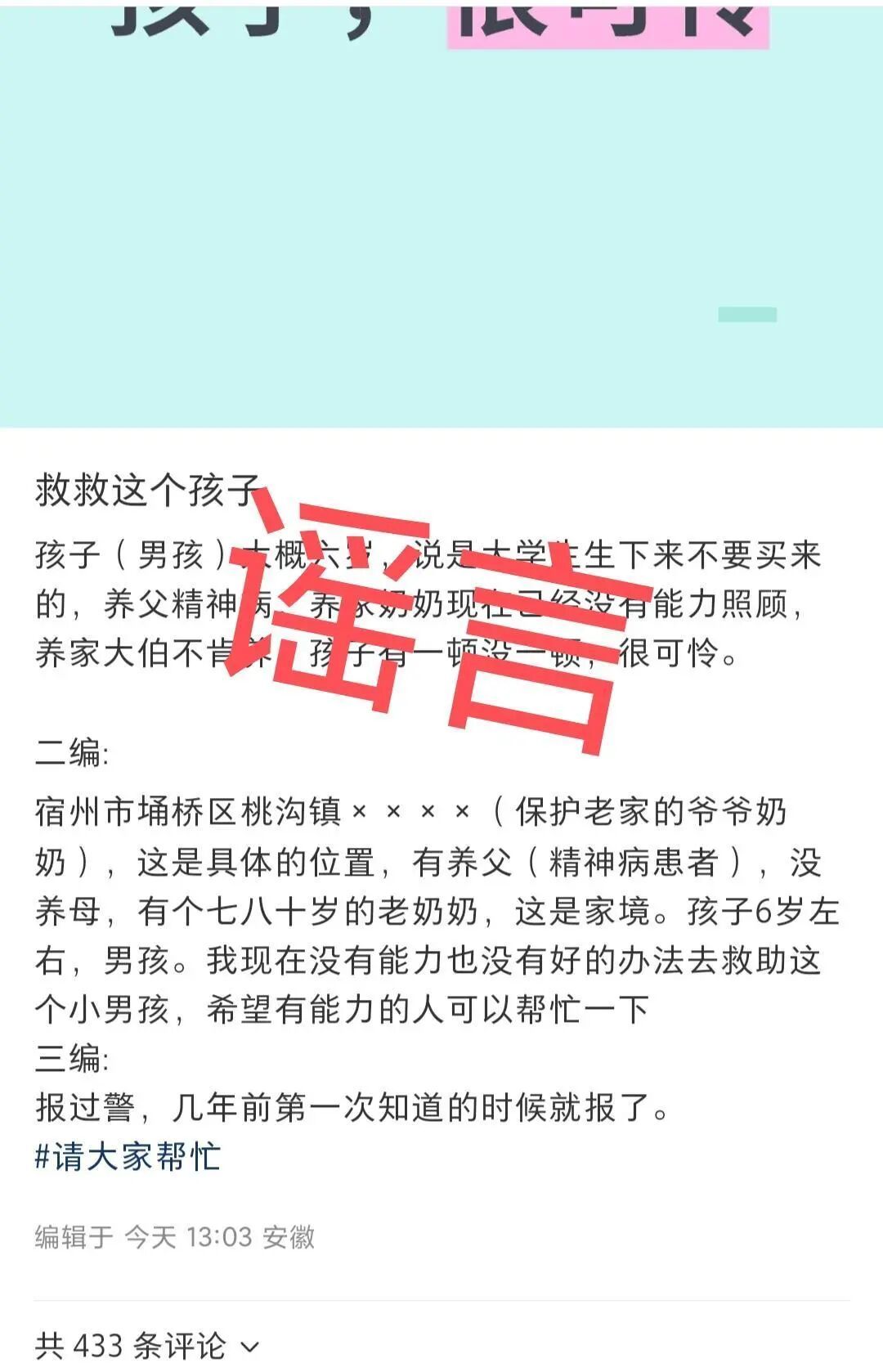 12月1日,安徽宿州一位网友在社交平台上发帖称,埇桥区桃沟镇一户村民,买来一名男孩,现在无力抚养,请网友帮忙。1日下午,桃沟镇政府工作人员向极目新闻记者表示,经初步调查,此事系谣言,公安机关也已介入。