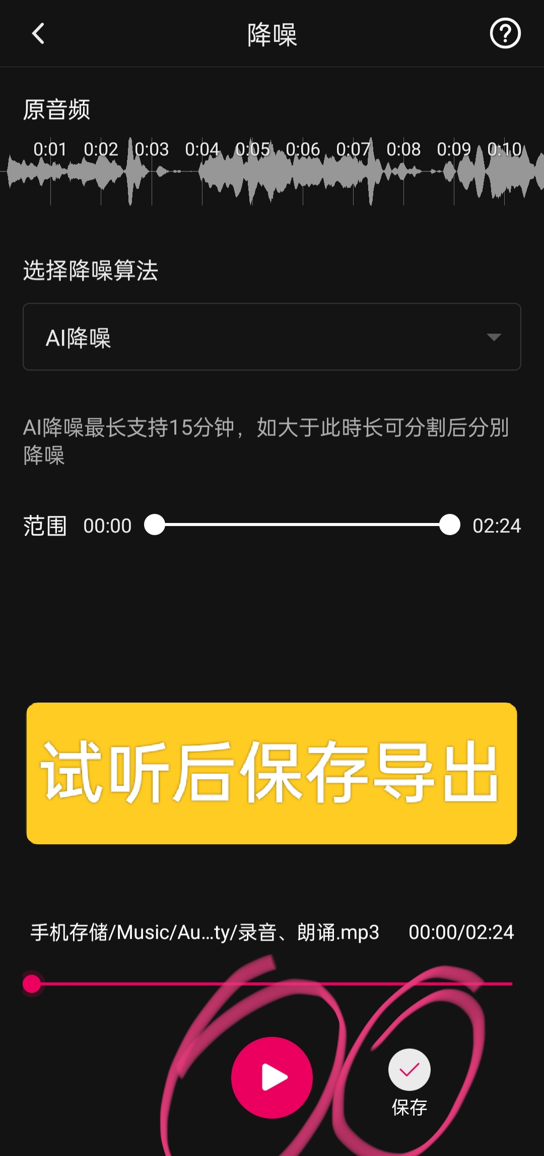 降噪完后一定要试听下,尤其注意戴耳机试听,背景噪音白噪音是否去干净,可以长按对比播放原音频