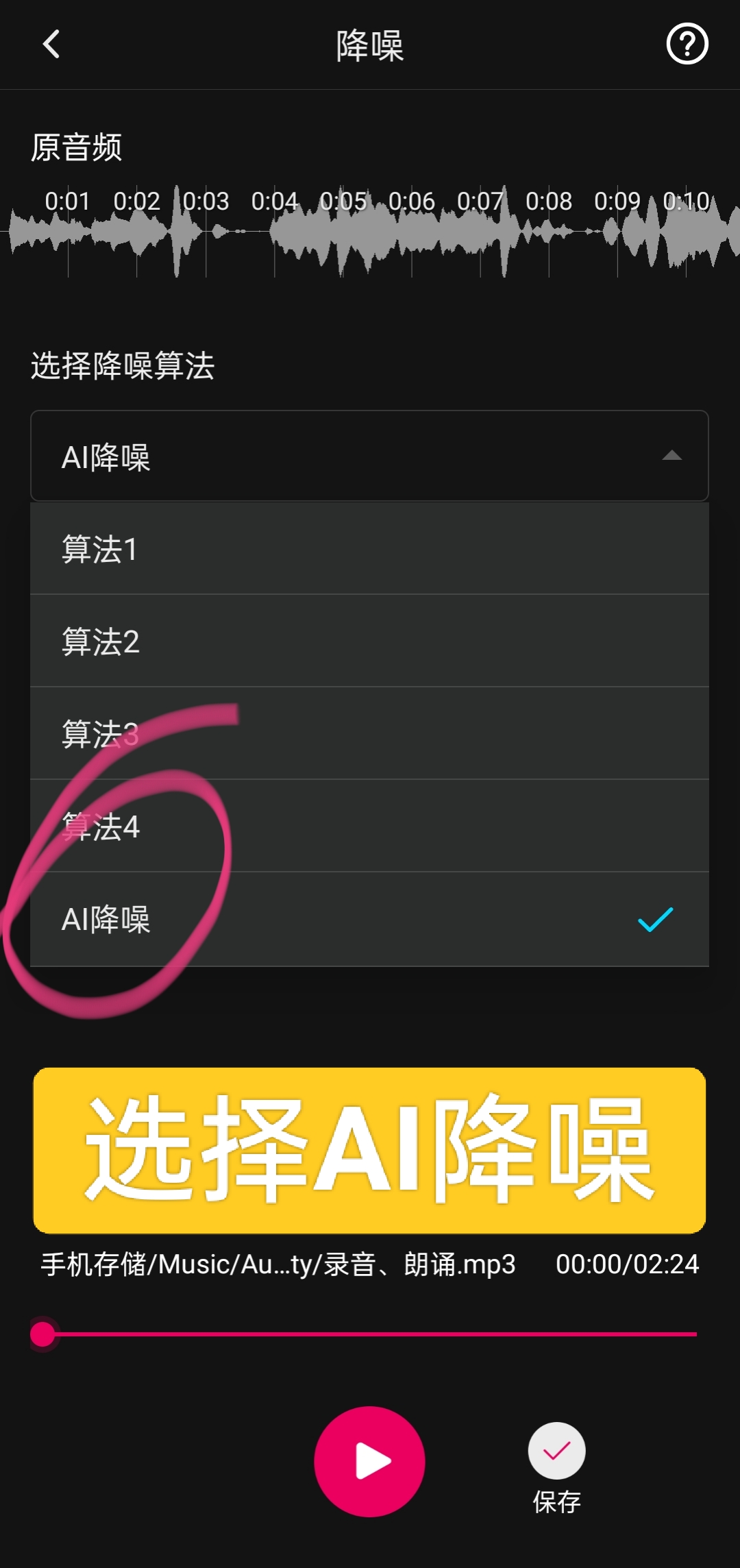 在降噪算法中选择“AI降噪”。(展示第3张图所示)