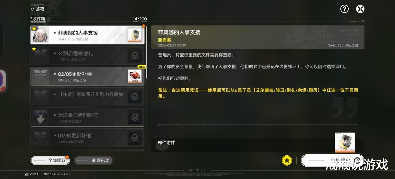 这个数据是不是很惊人?对于还没有入坑的玩家来说还有一个好消息,游戏内会下调不同探索等级的敌人等级,比如将探索等级6的敌人等级由60级下调至55级,调整后55级的敌人与调整前60级的敌人掉落相同。最最最重要的就是,为降低配队难度,提高前期战斗和探索体验,当你完成主线任务【第一章 - 进程I - 基地解围】的节点后会获得【自选调用凭证】×1,使用后可自选调用1位基础寻访的6星干员。基础寻访的有余烬、黎风、艾尔黛拉、别礼和骏卫,如果已经完成的也能在邮箱里直接收到。