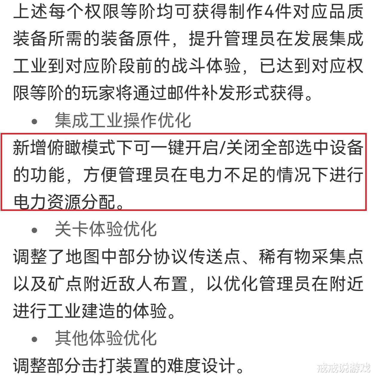 除了送常驻六星以外,官方还在这次更新里做了一大波优化,比如降低玩家的装备制造等级要求,让你在面对高难度BOSS和副本的时候更加的从容,俯瞰模式下可以一键关闭/开启选中装备的电能,这个功能好啊,终于不用为了电力不足收纳东收纳西了。
