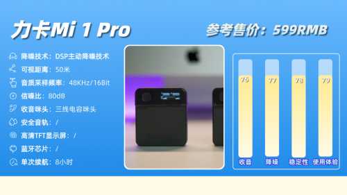 力卡Mi 1 Pro以专业配置适配创作需求,33.2g发射器搭配弹力背夹,夹在西装或摄影马甲上稳固不晃。配件丰富到贴心,MFi转接头、相机/手机专用线一应俱全,手机、单反即插即用,开机2秒自动配对,OLED屏清晰显示电量与信号,小白也能快速上手。