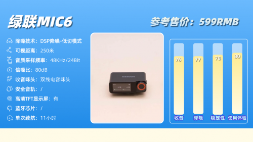绿联MIC6以一拖二配置适配双人场景,27g发射器支持背夹与磁吸双固定,夹在衣领上稳固不晃,磁吸方式贴附西装内衬也隐蔽。接收器带1.05英寸彩屏,电量、增益等参数一目了然,冷靴卡口可直连相机,搭配MFi认证线,手机、电脑无缝衔接,配件收纳包能统装所有线材,外出很省心。