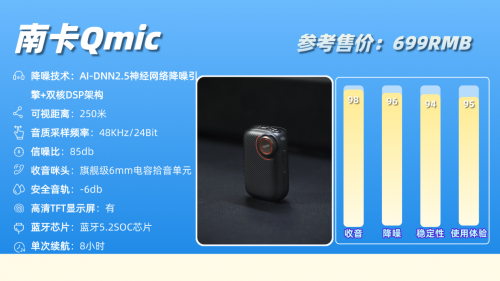 性能配置上,南卡QMic采用48kHz采样率+24Bit位深的旗舰级录音规格,还搭载AI-DNN2.5神经网络降噪,以及严格遵循专业级声学标准,结合三重防爆音系统与双核DSP并行架构,实现人声还原度高达98%以上。再加上20档增益调节与双档可调降噪,6dB安全音轨实时备份、实时监听耳返等多种功能,其内置的鲸语Comm通信技术,实现最远250米稳定收音,使得收音细节与稳定性达到行业巅峰,被誉为“领夹麦行业的真旗舰”,属于盲选不会错的产品!