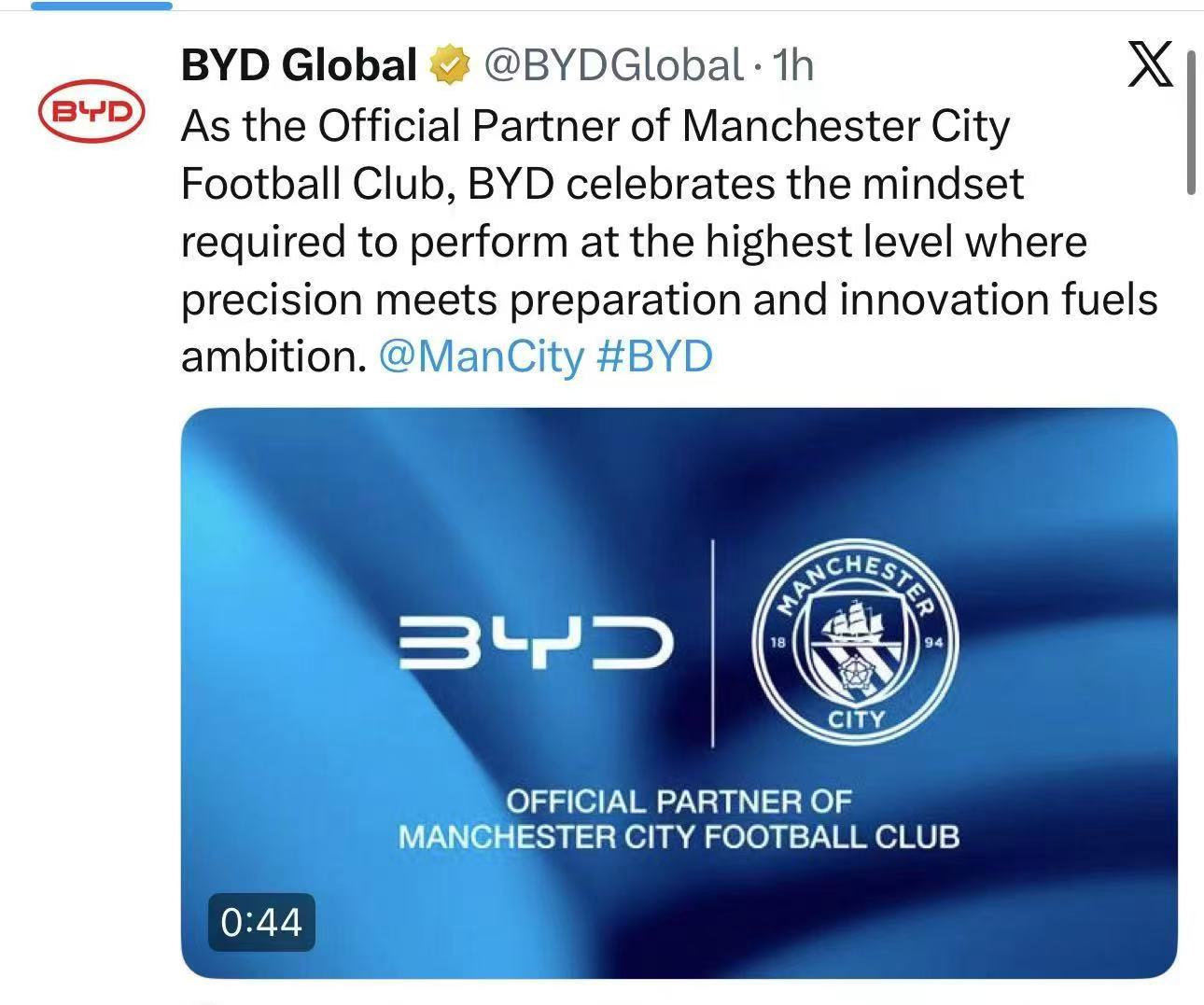 自欧洲杯和国米之后,2026年2月11日比亚迪官宣成为曼城足球俱乐部官方合作伙伴,这是比亚迪全球化战略、深化全球体育营销、助力绿色出行全球化的重要举措。