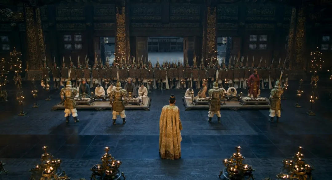 鉴于商朝是承前启后的朝代,王权的象征也要具有传承性。据赵首艺介绍,光是商王殷寿登基所持的玉钺,就让剧组美术部门耗费了不少心思:“我们找到了浙江省博物馆藏的良渚文化的神人兽面纹瑁镦组合玉钺,再综合参考了故宫博物院馆藏,以及河南博物馆透雕夔龙纹铜钺等,最终确定了殷寿玉钺的造型。”不仅如此,商朝及朝歌的典型符号,饕餮、玄鸟等也在细节设计中有所体现,使得这把玉钺成为无上王权的至高体现。