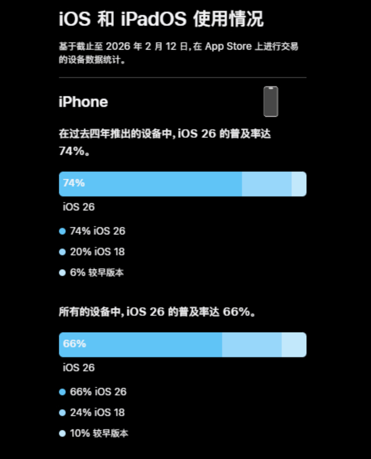 根据苹果提供的消息,在过去四代手机中,iOS 26的安装率达到74%,也就是说大约有16%的手机用户仍然停留在iOS 18系统之中,大概率是因为忘记更新,或者是懒得更新,不过如果将统计范围增加到所有能够支持升级到iOS 26系统的手机中去,那么整体的安装率就会有所下降,为66%,看起来大部分消费者还是选择将自家手机升级到iOS 26。