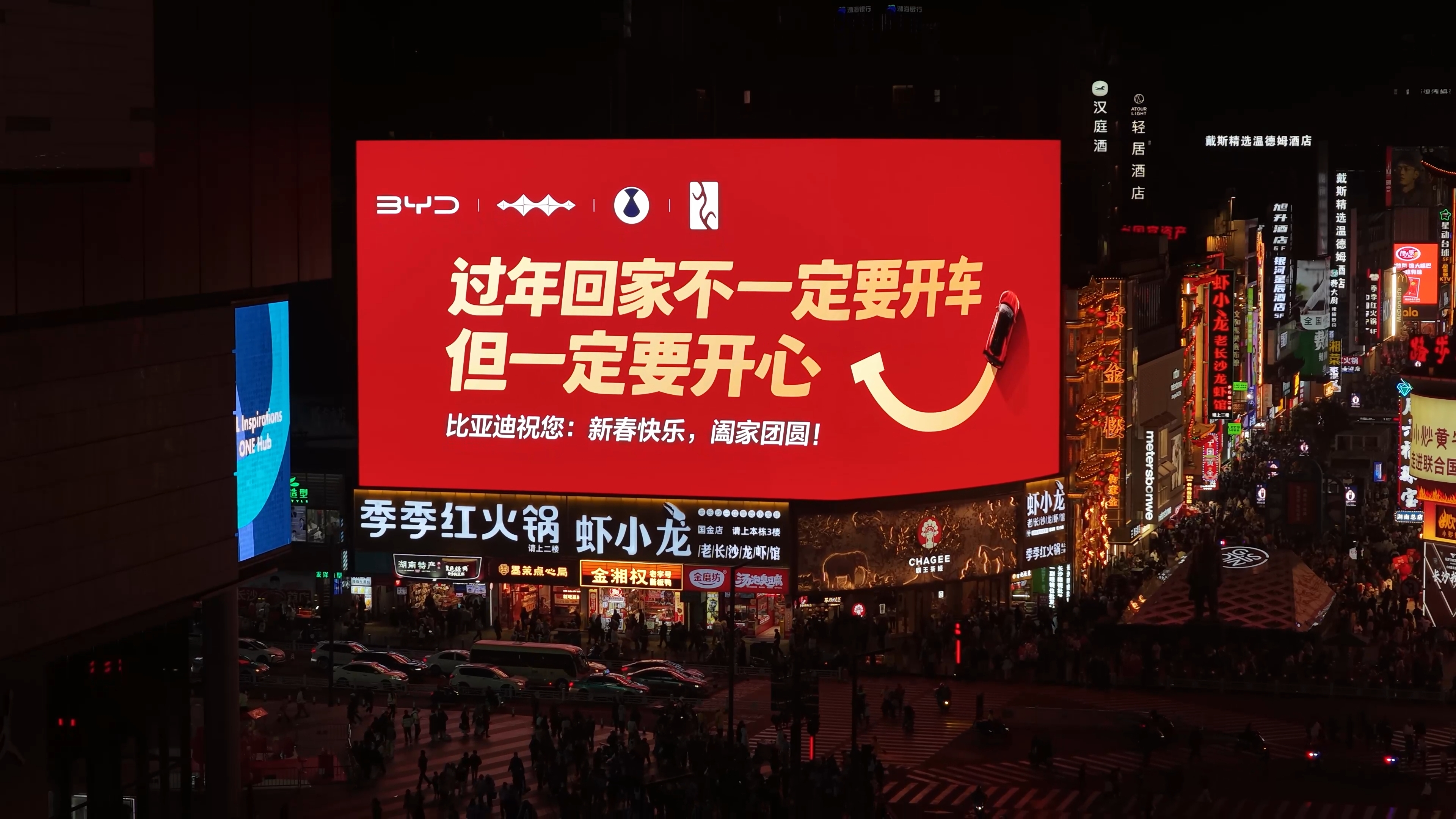 这个春节,比亚迪用春节户外广告传递着“开心哲学”,让我们在奔赴团圆的路上,感受到了品牌的关怀与温暖。
