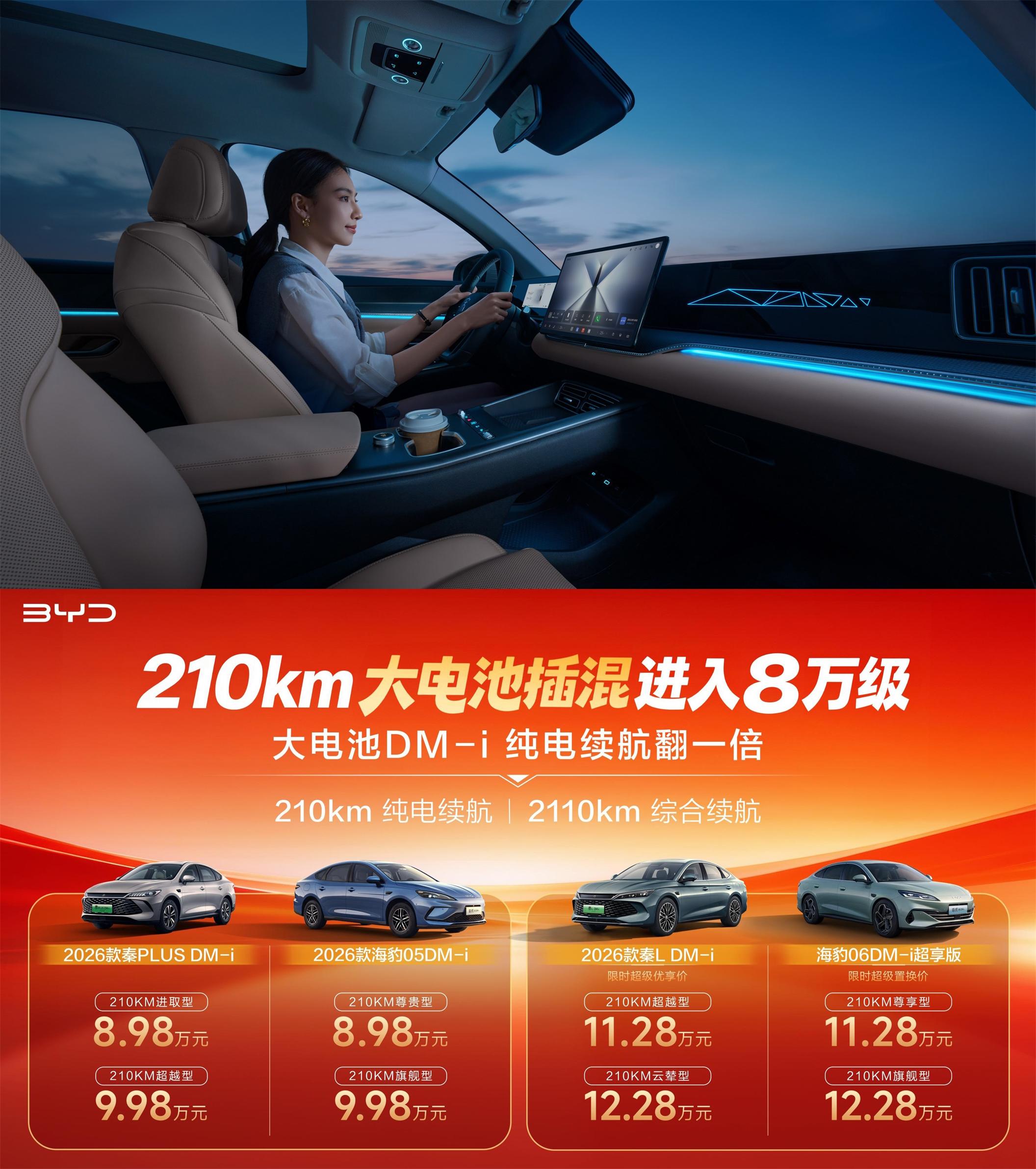 2026年开年,秦PLUS DM-i、海豹05 DM-i、秦L DM-i、海豹06 DM-i这四款家轿车型齐刷刷加推了大电池版,插混电力再加码,纯电续航直接拉到210公里。啥概念?我每天上下班来回40公里,充一次电能撑整整一周,周末还能顺便去郊个游、探个亲,也不用惦记油耗。更别说综合续航2100多公里,跨省出行、长途自驾完全从从容容,不再需要提前规划加油站,这完全是我理想中的插混。
