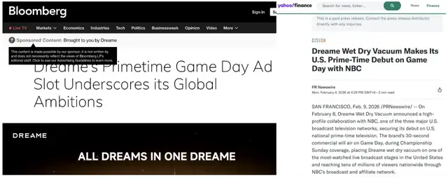 配合超级碗广告的动作,追觅也在Bloomberg、Yahoo Finance等渠道进行了内容赞助。