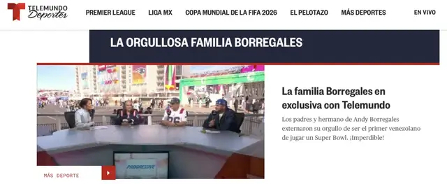 为了锁死这部分注意力,Telemundo也定制化地准备了不少内容:在2026年超级碗当天,Telemundo 开启了史上最大规模的直播,并特别强调了 Andy Borregales(委内瑞拉裔超级碗球员)。Telemundo 通过深度挖掘他的成长故事,将橄榄球赛包装成了拉美社区的“家族叙事”,吸引了大量原本不看橄榄球的拉美移民。