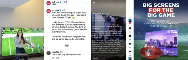 比如TCL就不断亮明NFL“官方电视合作伙伴”(Official TV Partner)的身份,推广核心产品、发起促销活动。TikTok、Instagram、Facebook等社交媒体上,种草内容眼花缭乱。其实TCL一直在体育营销上就肯下血本,今年冬奥会,TCL也是深度参与,打造了一个属于自己的“传奇二月”。