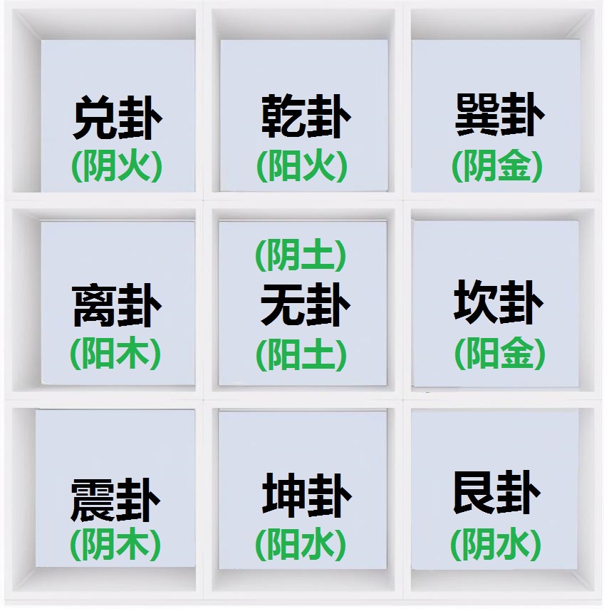 八神没有五行属性,也不符合对宫相冲定律,更没有任何象意,代表人的潜意识。先天八卦同样符合对宫相冲定律,八卦就是五行,八卦也没有象意,也与风水无关联。