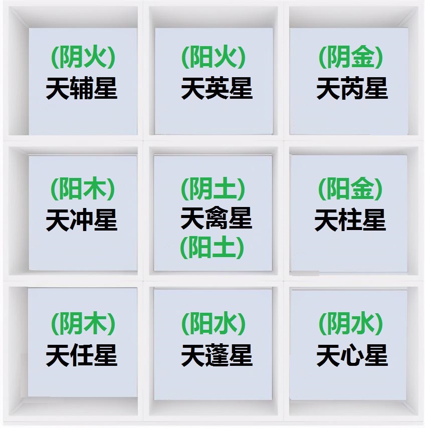 同理,天蓬星与天英星对冲,天冲星与天柱星对冲,天辅星与天心星对冲,天任星与天芮星对冲,天禽星(五行属土)中央伏吟不动。