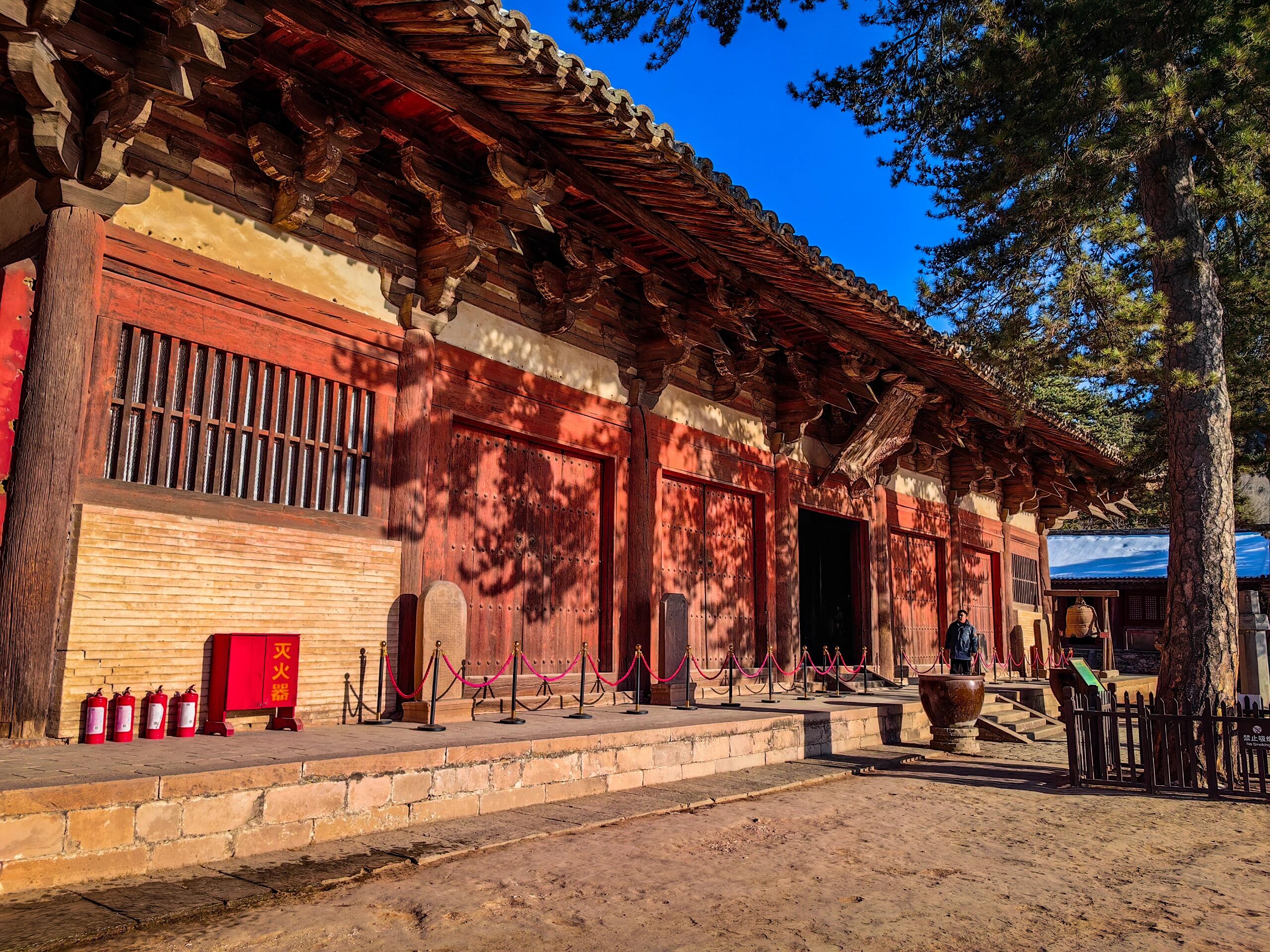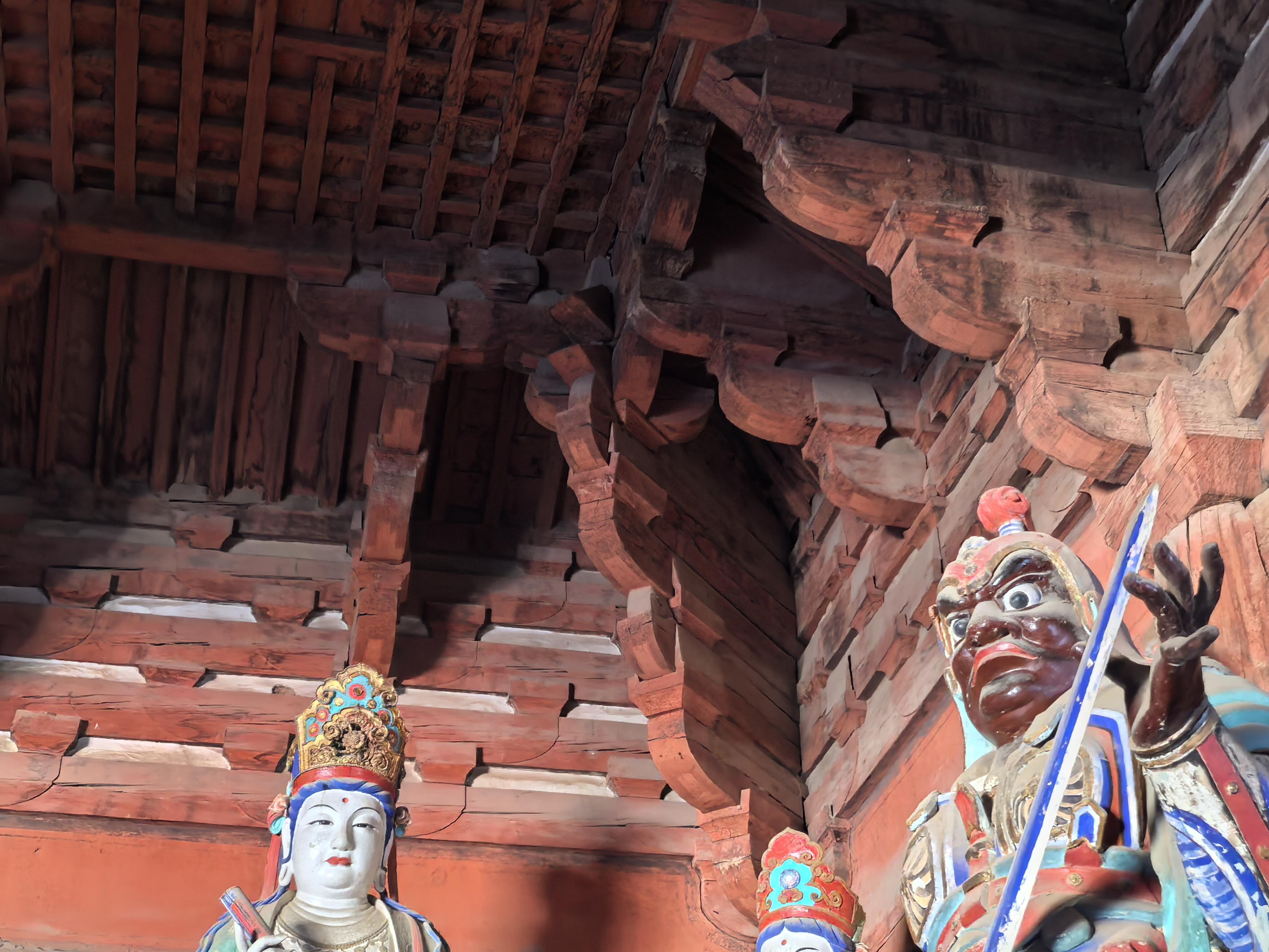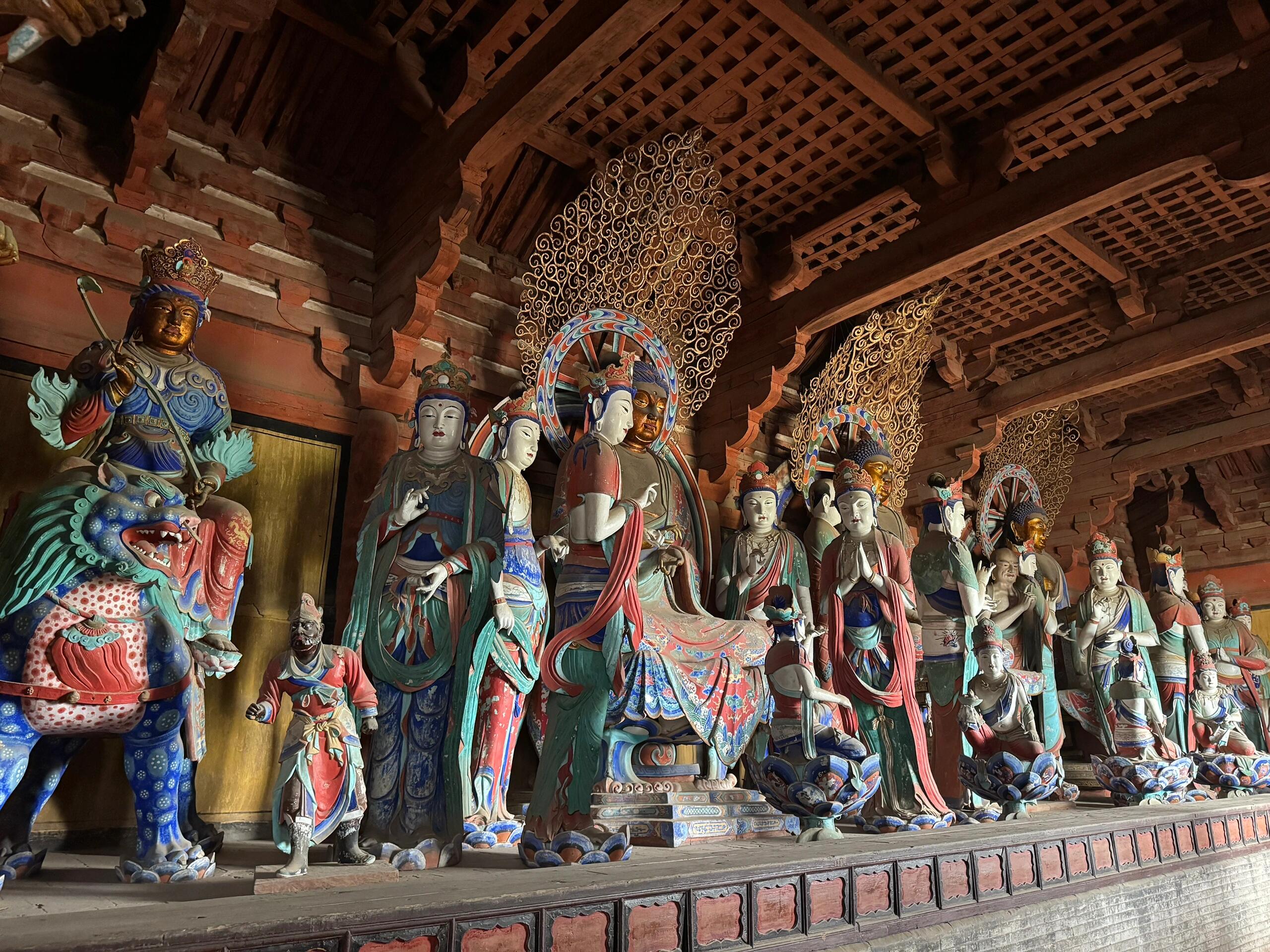 穿过山门,首先见到的是文殊殿,这座七间大殿看似与其他古寺的殿宇并无二致,仔细观察却能发现它的特别之处——它是金代建筑的典型代表。与唐代建筑的雄浑大气不同,文殊殿的斗拱更显精巧,梁架结构也多了几分灵动,尤其是殿内的梁枋,没有使用一根立柱支撑,全靠斗拱与梁架的巧妙咬合来承重,这样的工艺在金代建筑中并不多见,也让这座殿宇成为了研究宋金时期建筑技术的重要实例。站在文殊殿内,抬头望向屋顶,那些已经历经近千年的木构件,依然严丝合缝,没有一丝松动,仿佛当年的匠人刚刚放下手中的工具,转身离开。