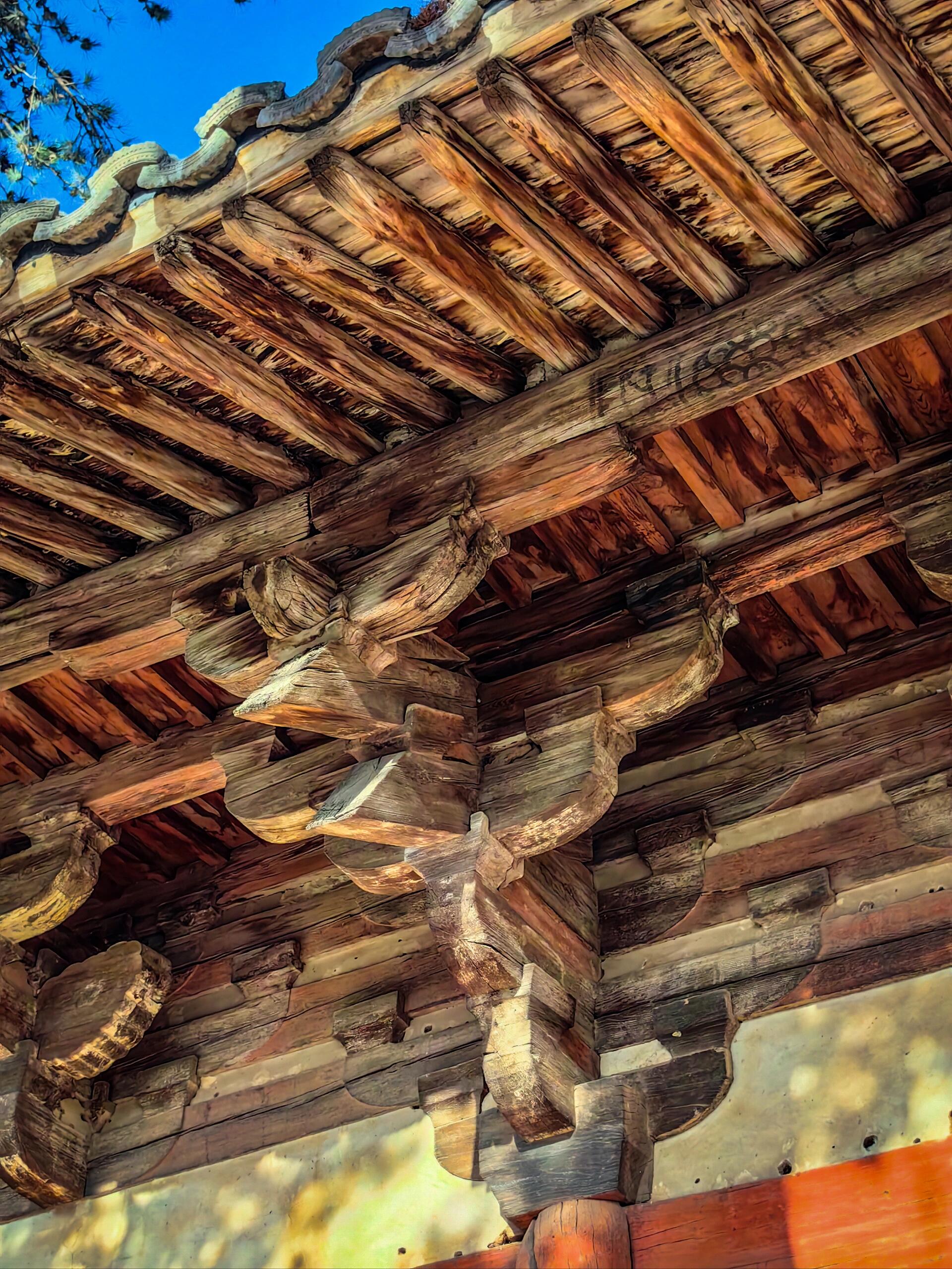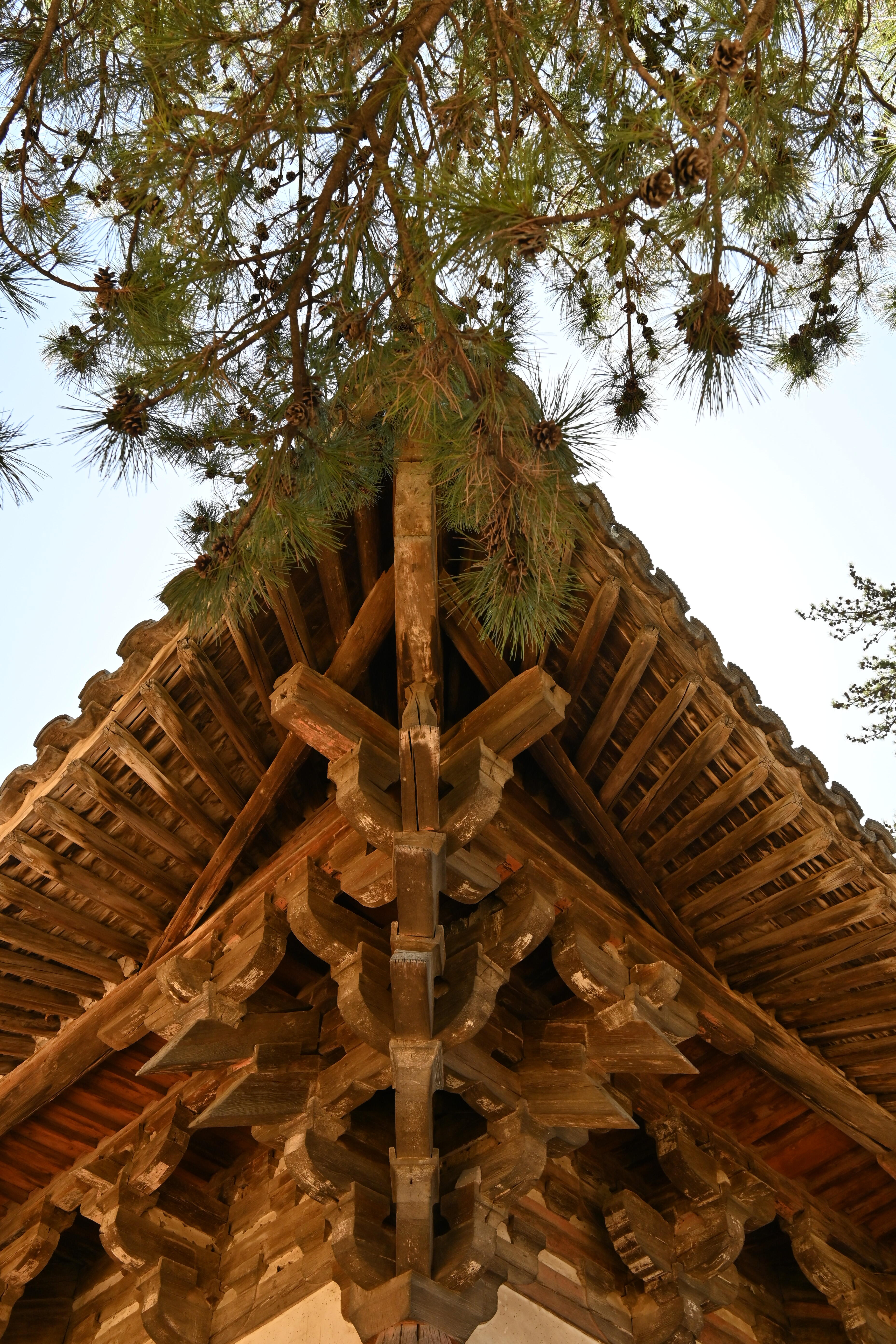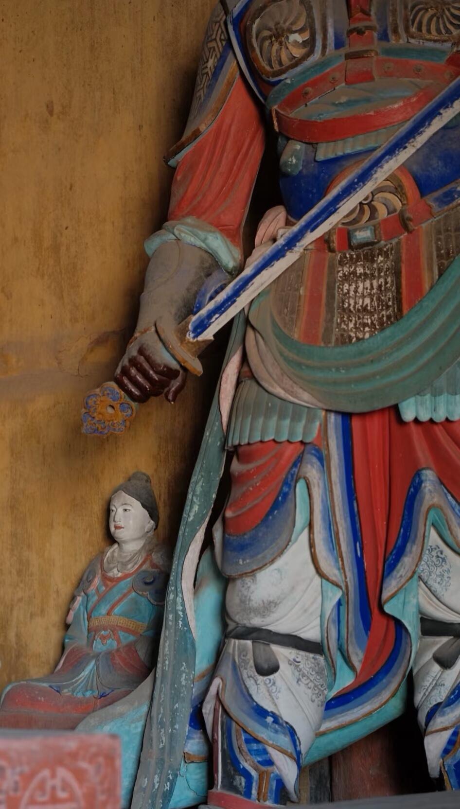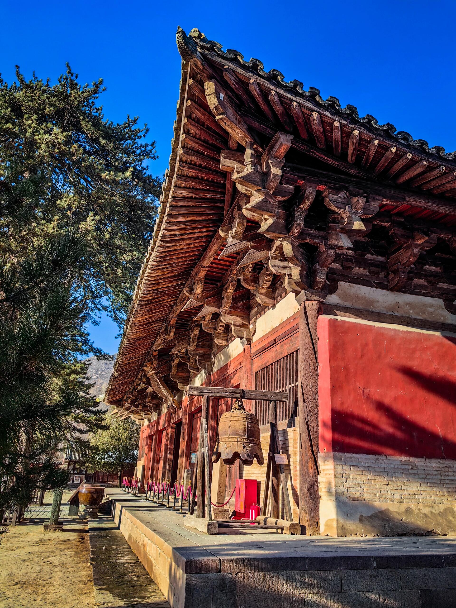 穿过山门,首先见到的是文殊殿,这座七间大殿看似与其他古寺的殿宇并无二致,仔细观察却能发现它的特别之处——它是金代建筑的典型代表。与唐代建筑的雄浑大气不同,文殊殿的斗拱更显精巧,梁架结构也多了几分灵动,尤其是殿内的梁枋,没有使用一根立柱支撑,全靠斗拱与梁架的巧妙咬合来承重,这样的工艺在金代建筑中并不多见,也让这座殿宇成为了研究宋金时期建筑技术的重要实例。站在文殊殿内,抬头望向屋顶,那些已经历经近千年的木构件,依然严丝合缝,没有一丝松动,仿佛当年的匠人刚刚放下手中的工具,转身离开。