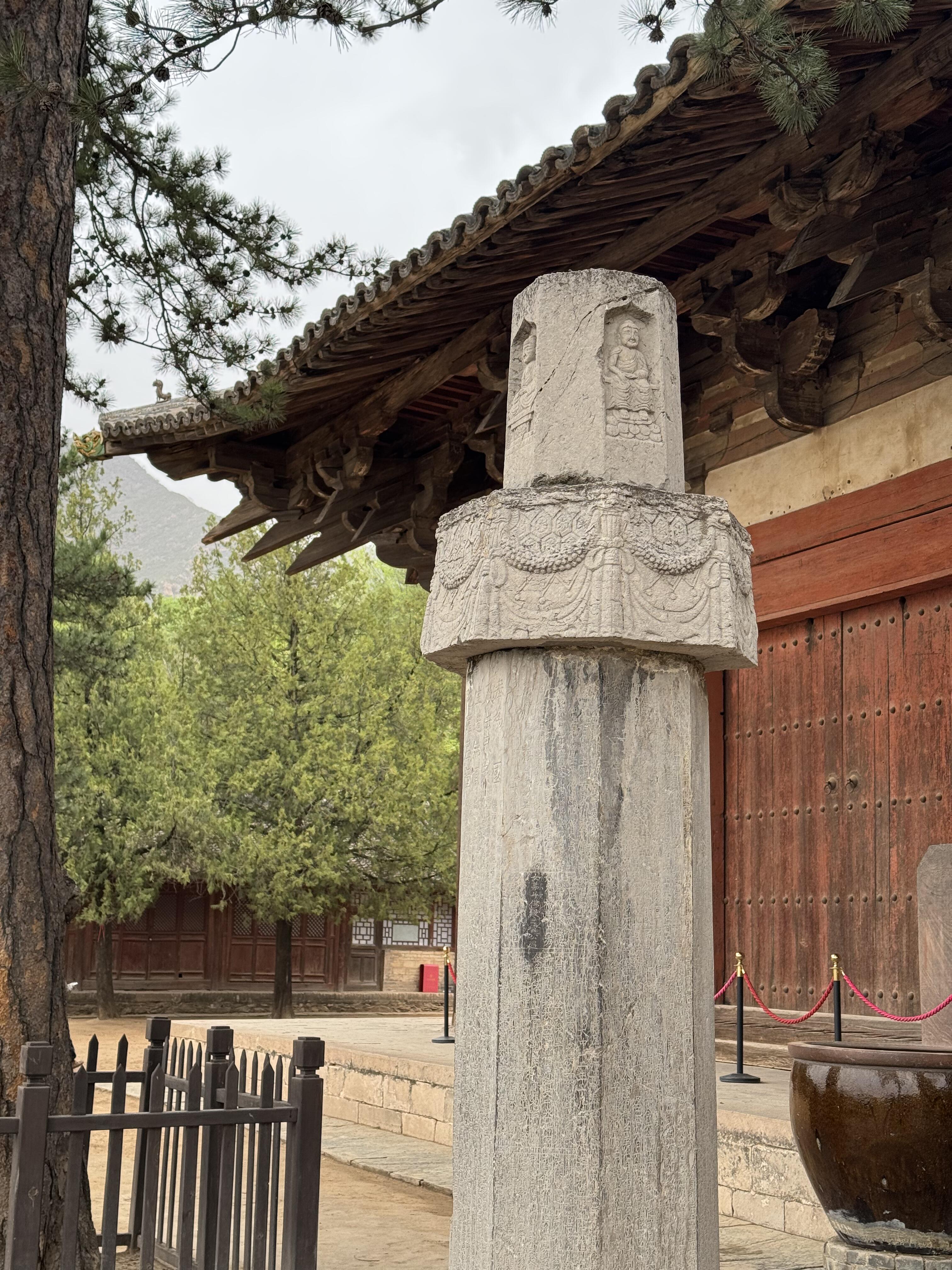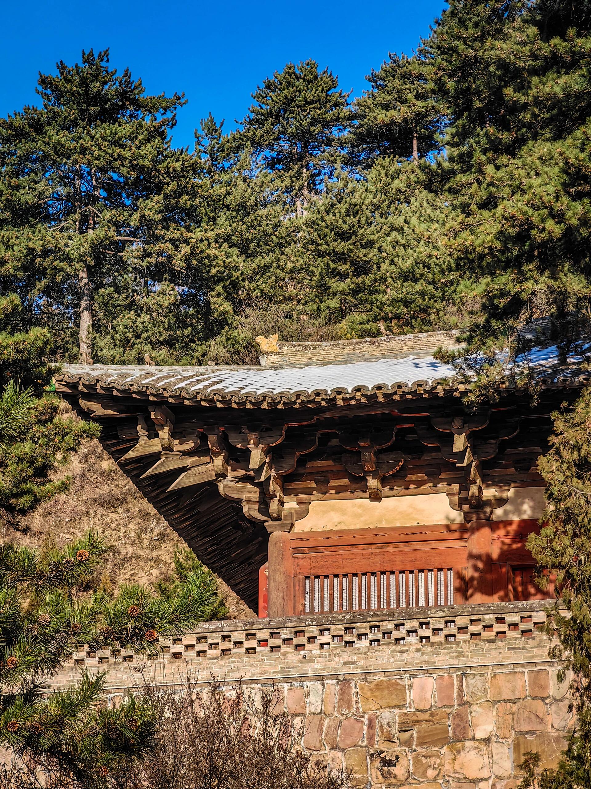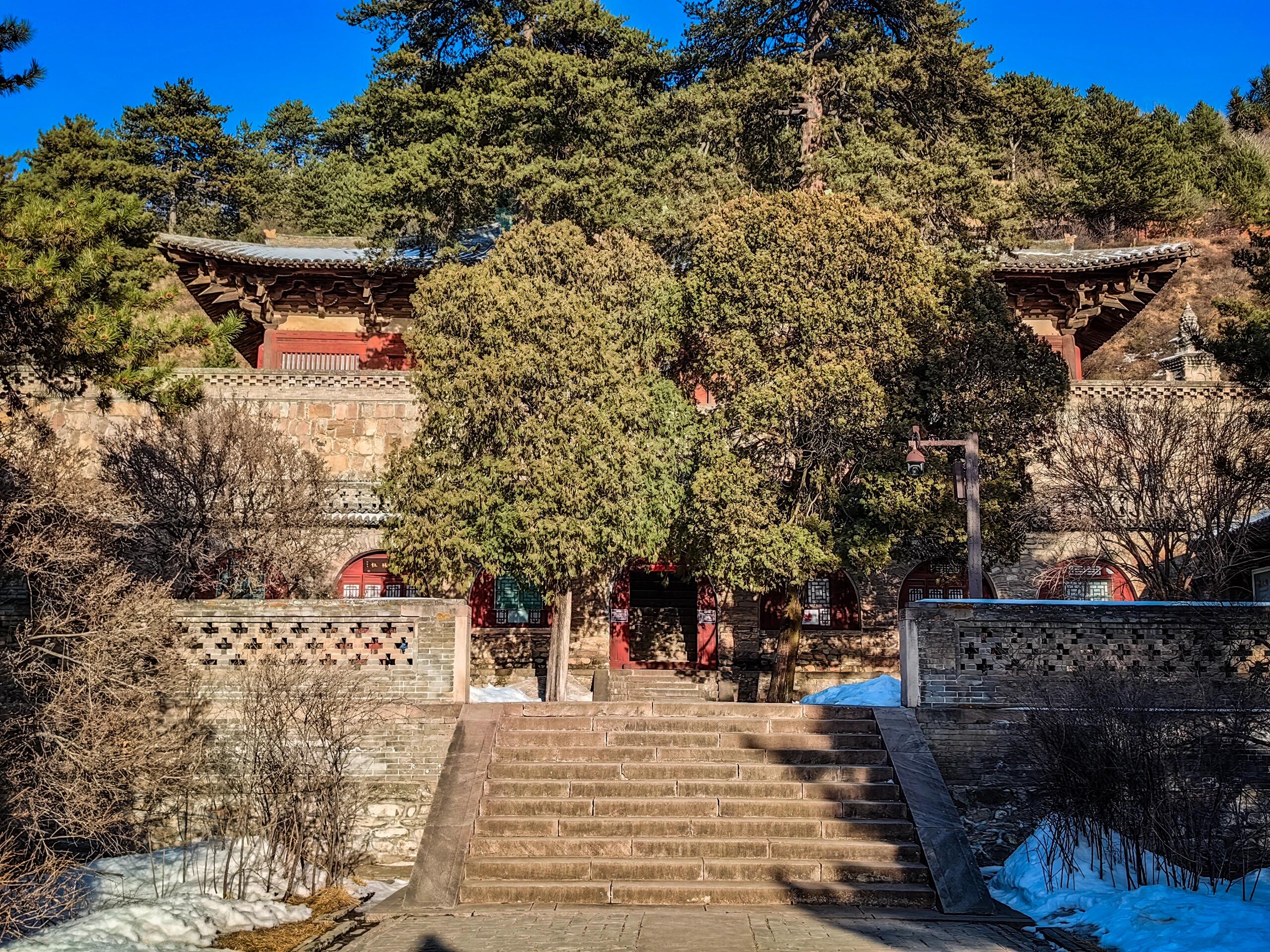 走上寺庙的台阶,才发现整座佛光寺是依据地形处理成的三个平台,沿着东西方向的主轴线依次铺开,从低到高,层层递进,就像是在山间搭建的一座立体画卷。最下方的平台是山门与一些附属建筑,中间平台分布着文殊殿与几座配殿,最上方的平台则是东大殿的所在地,这样的布局既顺应了山势,又让寺庙的层次感十足,每走一步,看到的风景都不尽相同。