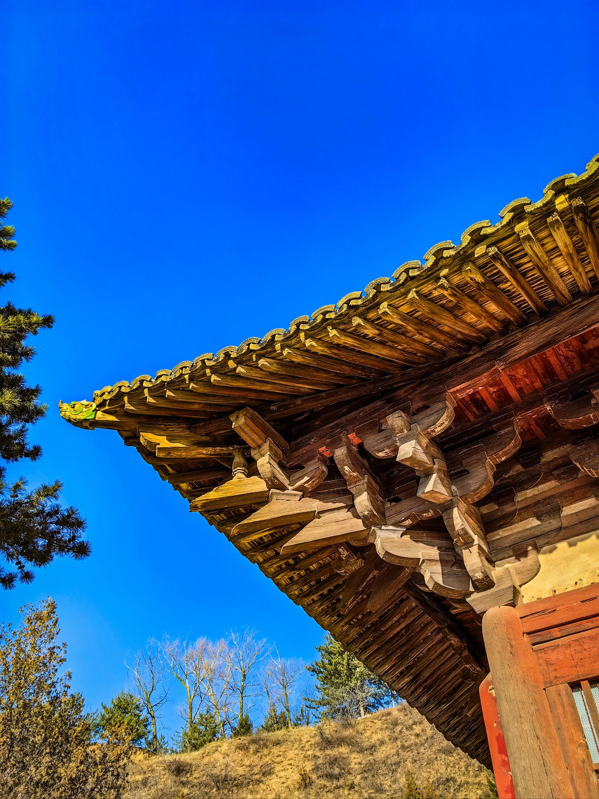 岁月流转,到了唐大中十一年(857),佛光寺迎来了它生命中最重要的一次蜕变。这一年,一位名叫宁公遇的女居士慷慨捐资,邀请匠人对寺庙进行重建。谁也不曾想到,这次重建不仅让佛光寺在战火与时光的侵蚀中站稳了脚跟,更让它成为了如今中国现存最完整、最典型的唐代建筑之一。当我们如今站在山脚下仰望,最先映入眼帘的便是东大殿那标志性的“四阿顶”——也就是俗称的庑殿顶,这种屋顶形制在唐代只有皇家宫殿与最高等级的寺庙才能使用,屋顶两端微微上翘的飞檐,像是展翅欲飞的仙鹤,既带着皇家的威严,又藏着中式建筑独有的灵动。