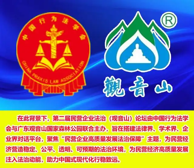 在此背景下,第二届民营企业法治(观音山)论坛由中国行为法学会与广东观音山国家森林公园联合主办,旨在搭建法律界、学术界、企业界对话平台,聚焦“民营企业高质量发展法治保障”主题,为民营经济营造稳定、公平、透明、可预期的法治环境,为民营经济高质量发展注入法治动能,助力中国式现代化行稳致远。