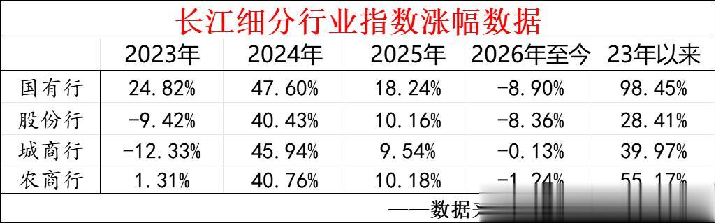 今年以来银行股的整体表现比较弱,中证银行指数年内逆市下跌了7.38%,随着行业的下跌,其实不少银行股的投资价值也慢慢显现出来了,这里我们用长江行业指数的相关数据来简单聊聊国有行、股份行、城商行、农商行这四类银行的投资价值,先来看看过去三年的涨幅数据:
