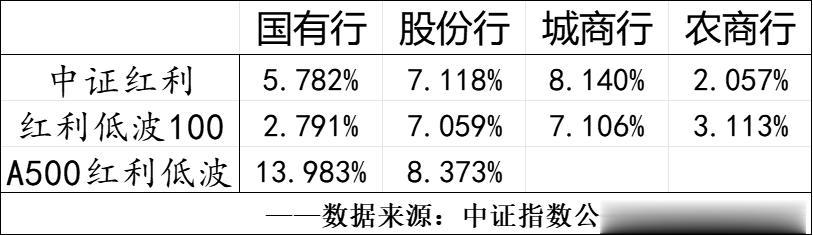 区别较大的地方在于A500红利低波指数,其只纳入了国有行和股份行,原因主要是母指数中并没有多少银行股可供选择,A500指数中银行业的权重仅有5.91%、只纳入了9只自由流通市值较大的大型银行股,而这9只大型银行股中有8只又被A500红利低波纳入了(浦发银行股息率过低没纳入)。可以预见得到的是,在未来很长一段时间内,A500红利低波指数的银行业权重都不会过高(可供选择的银行股较少&行业上限限制)、而且基本以国有行&股份行为主(自由流通市值足够大),这也是为什么说A500红利低波指数内在稳定性较高的原因之一。