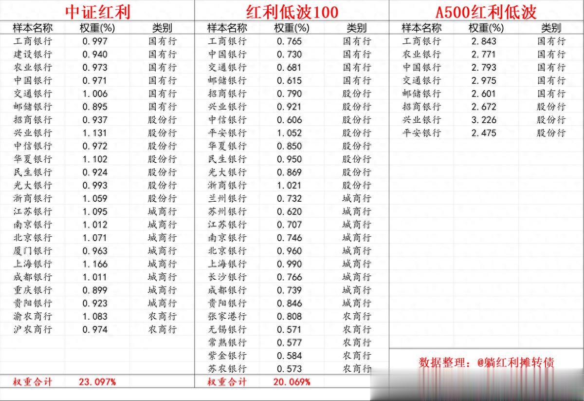 这里我们选定中证红利、红利低波100和A500红利低波这三只指数,理由是这三只红利指数编制方式合理、样本&行业分散性做的比较好,具备相当的长期内在稳定性,下图是这三只红利指数的银行股构成: